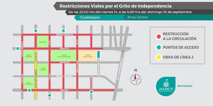 La Secretaría de Movilidad (SEMOV) y la Fiscalía General del Estado (FGE) Jalisco recordaron que a partir de las 22 horas de hoy y hasta las 16 horas del domingo 16 de septiembre, cerrarán circulación en más de 10 calles del Centro Histórico de Guadalajara y se tendrán filtros de seguridad.Los cierres estarán presentes en avenida Juárez, entre Galeana y Degollado, Morelos, entre Corona y Degollado; avenida Hidalgo, desde Santa Mónica y hasta Humbolt; Independencia, entre Santa Mónica y hasta Humbolt.También, desde Juárez hasta Independencia, la calle Galeana, 16 de septiembre, Corona, Pino Suárez, Degollado, así como Antonio Molina.Por otro lado, los puntos de acceso a la plaza de Armas y zona Centro, serán avenida Alcalde, cruce con Independencia; avenida Hidalgo, frente a la Merced; avenida Juárez, entre Colón y avenida Alcalde; Corona, entre López Cotilla y Juárez; avenida Juárez, cruce con Degollado, y Paseo Collado, cruces con avenida Hidalgo, paseo Degollado y paseo del Hospicio.Durante esta conmemoración se tendrán filtros de la Fiscalía General del Estado. Está prohibido ingresar con: armas de fuego, replicas o punzocortantes; drogas o bebidas embriagantes; mascotas, excepto perros guía; botellas u objetos de vidrio o plástico; objetos que puedan ser usados como proyectil, por ejemplo frutas, banderas con asta, paraguas, cubiertos, hebillas; encendedores, cerillos, pirotecnia o sustancias inflamables; apuntadores con láser, rollos de papel y trapos.LR
