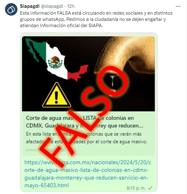 Las olas de calor consecutivas han dejado temperaturas no vistas en México. Guadalajara ha sido una de las ciudades más afectadas, llegando a tener días mucho más calientes que en los municipios costeros.Las olas de calor no solo traen consigo mediodías difíciles, sino también apagones masivos ante el uso excesivo de energía. Debido a esto, en días pasados, diversas colonias de Guadalajara se quedaron sin agua debido a fallas en el sistema de luz, que tronaron los transformadores en la planta de bombeo Guadalajara-Chapala.¿Habrá nuevos cortes de agua? Diversas noticias, medios de comunicación e imágenes difundidas en redes sociales anunciaron que Guadalajara padecería un corte de agua masivo, que afectaría a estas colonias en el transcurso de los siguientes días:De acuerdo con la información difundida, el Sistema Intermunicipal de los Servicios de Agua Potable y Alcantarillado (Siapa) recortaría el servicio de agua debido a que la ciudad se enfrenta a una demanda de agua que supera la capacidad del sistema.No obstante, el Siapa, a través de sus redes sociales oficiales, informó que esta noticia que está circulando es falsa, y piden a la ciudadanía de Guadalajara que consulten directamente en las páginas de la institución para no caer en desinformación. La tercera ola de calor ha llegado a México, y se esperan temperaturas de hasta 40 grados en Guadalajara. Mantente al día con las noticias, únete a nuestro canal de WhatsAppFS