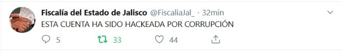 La cuenta de Twitter de la Fiscalía del Estado, a través de la cual informa sobre diversas acciones y recomendaciones a la ciudadanía, fue hackeada y modificada esta tarde.El ataque al sistema ocurrió alrededor de las 18:30 horas. Quienes intervinieron la cuenta modificaron el nombre del usuario y la foto del perfil oficiales que identifican a esta dependencia.A las 18:32 horas enviaron el primer mensaje, en el cual confirmaban el hackeo. De ahí vino una serie de mensajes de descalificación hacia distintos frentes sociales.De acuerdo con el Gobierno del Estado, la Policía Cibernética de la propia Fiscalía ya interviene para restablecer el control de la cuenta e iniciar las investigaciones correspondientes."Rechazamos categóricamente ser el origen de los mensajes que se emiten desde esta cuenta, en tanto no se recupere su control. Condenamos estos ataques que representan un atentado a la libertad de información por parte de una dependencia oficial", manifestó el Gobierno jalisciense a través de un comunicado.JM