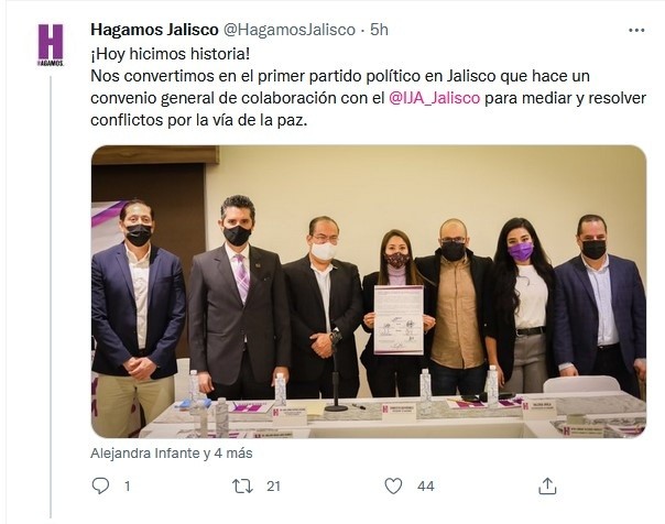El partido Hagamos firmó un convenio de colaboración con el Instituto de Justicia Alternativa (IJA) para generar acciones hacia el interior del partido, así como en los municipios que son gobernados por Hagamos, en favor de la cultura de paz y la mediación.“El momento social en el que vivimos requiere que busquemos alternativas para salir adelante para recuperar la paz. En Jalisco no podemos seguir con esa dinámica social con la que se viene desarrollando, cualquier esfuerzo debe ser en serio y el rol de los partidos es muy importante. Este es el banderazo de salida, ya que Hagamos es el primer partido en este tipo de colaboración y convenio ante el Instituto de Justicia Alternativa”, subrayó Ernesto Gutiérrez Guízar, presidente del instituto político. En la firma del convenio estuvo Guillermo Zepeda Leucona, titular del IJA, entre otros.Valeria Ávila Gutiérrez, vicepresidenta del partido, indicó que esta firma es histórica, por ser un convenio con una serie de capacitaciones, “donde nos pone en la vanguardia”.El diputado Enrique Velázquez González añadió que el convenio tiene la propuesta de llevar adelante la cultura de la paz y resolver los conflictos que hay en la vía pública, a través de la capacitación en las colonias.JM