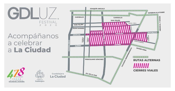 Debido al Festival GDLuz, se realizarán cierres viales en el Centro de Guadalajara del 12 al 15 de febrero, lo que a su vez provocará el desvío de rutas del transporte público.El Ayuntamiento tapatío informó que los cortes a la circulación serán desde las 5:00 PM hasta las 12:00 AM en vialidades que comprenden desde el Mercado Corona hasta el Instituto Cultural Cabañas.Las principales avenidas afectadas son Hidalgo y Juárez, entre González Ortega y la Calzada. También las calles San Felipe y Juan Manuel, la cual ya está cerrada en un tramo por obras, entre 16 de Septiembre y Calpulalpan.GDLuz comienza hoy como parte de las celebraciones por el 478 aniversario de la fundación de Guadalajara. Las instalaciones se iluminarán desde las 7:30 PM mientras los espectáculos inician a las 8:00 PM.La Secretaría de Transporte informó que cambiarán los derroteros de las rutas del transporte público por los cierres viales: C01 (antes 39A), 360 Esteban Alatorre Viene por – Garibaldi – inicia desvío – Garibaldi – Santa Mónica – San Felipe 156 Viene por – Garibaldi – inicia desvío – Garibaldi – Santa Mónica – RETORNO – Reforma – termina desvío C123 (antes 258) Viene por – Industria – inicia desvío – Mariano Jiménez – Gómez Farías – Francisco I. Madero – Contreras Medellín – San Felipe 153 Viene por – Industria – inicia desvío – Abascal y Souza – Esteban Alatorre – Dr. Baeza Alzaga – Garibaldi – Santa Mónica – RETORNO – Reforma – Termina desvío 110 Viene por - Pino Suárez – inicia desvío – Garibaldi – 8 de Julio – termina desvío 110-A y 258-A Viene por – Pino Suárez – inicia desvío – Garibaldi – Calzada del Federalismo – San Felipe – Termina desvío 174 Viene por – Pino Suárez – inicia desvío – Garibaldi – González Ortega – RETORNO – Reforma - Termina desvío 52B Viene por – Pino Suárez – inicia desvío – Garibaldi – Donato Guerra – Termina desvío. 320 Viene por – Santa Mónica – inicia desvío – Garibaldi – 8 de Julio – Termina desvío 633 tres vías y 275F Inicia desvío – Santa Mónica – Garibaldi – Calzada del Federalismo 52D Viene por – Miguel Blanco – inicia desvío – Contreras Medellín – Reforma – Belén – Termina desvíoNota: Las rutas que operaban por Juan Manuel continuarán por la calle Reforma.IM