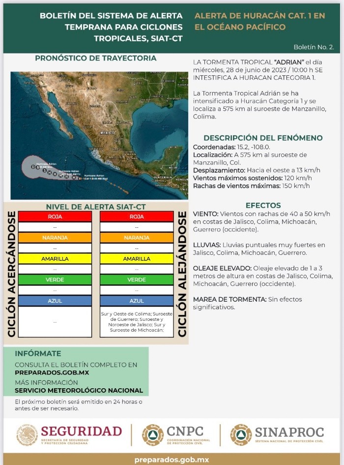 El primer huracán de este 2023 en el Oecáno Pacífico ya llegó. "Adrián" se convirtió en huracán categoría 1 este miércoles.La Unidad Estatal de Protección Civil aseguró que vigila el comportamiento del huracán “Adrián”, principalmente en las costas del Estado.Se localiza a 575 km al suroeste de Manzanillo, Colima, y continúa alejándose de territorio nacional. Según Protección Civil Nacional.La dependencia estatal informó que no representa peligro directo para Jalisco, aunque sí generará lluvias durante las siguientes horas.