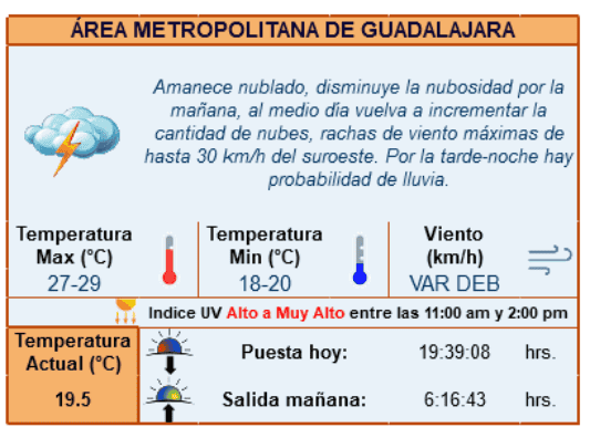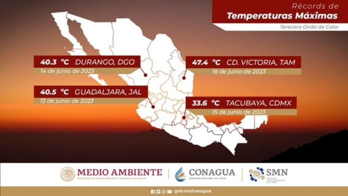Con la formación del huracán "Adrián" inició ayer miércoles la temporada de huracanes 2023 en el Pacífico mexicano, de acuerdo con el Servicio Meteorológico Nacional (SMN).México se libra de una fuerte y prolongada ola de calor, y al menos 5 estados del occidente, Colima, Jalisco, Michoacán, Guerrero y Nayarit, se han visto beneficiados con lluvias fuertes a muy fuertes, así como rachas de viento de 40 a 50 kilómetros por hora, informó el servicio perteneciente a la Comisión Nacional del Agua (Conagua).Las lluvias han traído consigo también la disminución de la temperatura y al menos en lo que respecta a la Zona Metropolitana de Guadalajara (ZMG) se reporta una baja de por lo menos 10 grados. Según el Informe semanal del Comité Técnico de Operación de Obras Hidráulicas de la Comisión Nacional del Agua (Conagua), con fecha del 20 de junio, se expuso que por los efectos de la Tercera Onda de Calor en junio, la temperatura máxima promedio alcanzada a nivel nacional fue de 34.8 grados Celsius, lo que supera los 34.1 grados Celsius de 2019, los 33.5 observados en 2020, y los 33.3 grados Celsius alcanzados en 2019 y 2022.Asimismo, subrayaron que este fenómeno ya generó que se superaran récords históricos de temperatura: en Ciudad Victoria, Tamaulipas, se llegó a 47.4 grados Celsius; en la Zona Metropolitana de Guadalajara (ZMG) en Jalisco, se registraron 40.5 grados Celsius; en Durango, Durango, se alcanzaron 40.3 grados Celsius, y en Tacubaya, Ciudad de México, se observaron 33.6 grados Celsius. El pasado 21 de junio se reportaron en la ZMG, por ejemplo, los termómetros alcanzaron 39 °C, mientras que para el día de hoy, según el Instituto de Astronomía y Meteorología (IAM) de la UdeG se pronostican entre 27 y 29 como máximo, a la par de una alta probabilidad de lluvias a lo largo del día.OF