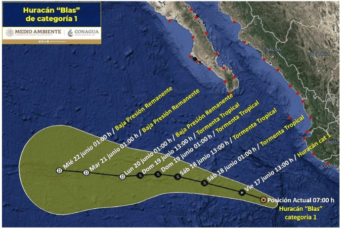 El Servicio Meteorológico Nacional, fuente oficial del Gobierno de México en materia climática, emitió la mañana de este jueves el aviso sobre el huracán "Blas" que continúa al suroeste de Jalisco y Colima, y que mantendrá lluvias muy fuertes a intensas en el sur y occidente de México.El centro del huracán "Blas", de categoría 1 en la escala de Saffir-Simpson, mantendrá la entrada de humedad hacia los estados del occidente de México, donde se pronostican lluvias muy fuertes a puntuales intensas, fuertes rachas de viento y oleaje elevado, señaló el organismo. Lluvias puntuales muy fuertes (50 a 75 mm) en Nayarit, Jalisco, Colima y Guerrero, lluvias puntuales fuertes (25 a 50 mm) en Sinaloa y Michoacán, además de chubascos en Baja California Sur. Dichas lluvias podrían generar incremento en los niveles de ríos y arroyos, deslaves e inundaciones en zonas bajas de los estados mencionados.De acuerdo al Servicio Meteorológico Nacional, el huracán "Blas" se encuentra ubicado a 400 km al suroeste de Playa Pérula, Jalisco, y a 440 km al suroeste de Manzanillo, Colima. Su desplazamiento actual es hacia el oeste-noroeste (295°) a 20 km/h y se espera que continúe su recorrido alejándose de las costas mexicanas e internándose al Océano Pacífico, donde a partir del sábado 18 de junio se espera cambie a tormenta tropical. Las recomendaciones de la autoridad son extremar precauciones a la población en general en las zonas de los estados mencionados por lluvias, viento y oleaje (incluyendo la navegación marítima) y atender las recomendaciones emitidas por las autoridades del Sistema Nacional de Protección Civil, en cada entidad.OA