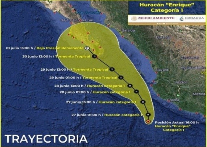 La Unidad Estatal de Protección Civil y Bomberos Jalisco (UEPCBJ) informó a través de sus redes sociales que debido al avance del huracán "Enrique" se actualizó el Sistema de Alerta Temprana para Ciclones Tropicales, en etapa de acercamiento.La alerta se distribuye de la siguiente forma para Jalisco:A las 16:00 horas, el centro del huracán fue estimado a 245 km al Suroeste de Barra de Navidad y a 345 km al Sur de Cabo Corrientes, Jalisco, a una velocidad de 11 kilómetros por hora, con vientos máximos sostenidos en 140 km/h y rachas de 160 km/h, informó la UEPCBJ.Por lo anterior, se mantiene la probabilidad de lluvias fuertes y puntualmente intensas para municipios de la costa Sur. Para municipios de la costa Norte, principalmente para Cabo Corriente, las lluvias más fuertes e intensas se podrían presentar en la tarde del domingo.NR