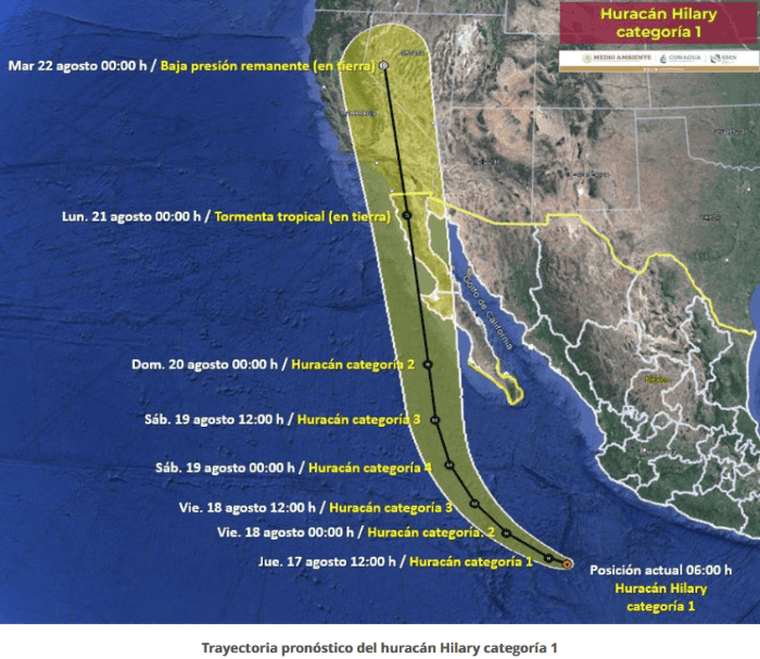 El huracán "Hilary" se formó la mañana de este jueves, y se encuentra, en su distancia al lugar más cercano en el territorio nacional, a 515 kilómetros al sur-suroeste de Manzanillo, Colima, y a 520 km al suroeste de Punta San Telmo, Michoacán; pero su trayectoria es por la costa del Pacífico mexicano hasta la península de Baja California, por lo que Jalisco tendrá impacto en su pronóstico climático, según la previsión del Servicio Meteorológico Nacional (SMN), fuente oficial del Gobierno de México en materia climática.Este día, las extensas bandas nubosas del huracán "Hilary", al suroeste de las costas de Colima y Jalisco, en interacción con inestabilidad en la atmósfera superior, propiciarán lluvias fuertes a puntuales muy fuertes en estados del occidente, centro y sur del México, incluido el Valle de México; así como rachas de viento fuerte y oleaje elevado en las costas de Guerrero, Michoacán, Colima y Jalisco.De forma detallada, se espera cielo nublado con lluvias puntuales muy fuertes en Michoacán, Colima, Jalisco y Nayarit, todas con descargas eléctricas, rachas fuertes de viento y posible caída de granizo, mismas que podrían reducir la visibilidad, originar el incremento en niveles de ríos y arroyos, así como generar deslaves, inundaciones y encharcamientos. Ambiente cálido a caluroso por la tarde. Viento de componente sur de 15 a 30 km/h en la región, así como del sureste con rachas de 70 a 90 km/h y oleaje de 4 a 6 metros de altura en costas de Jalisco, Colima y Michoacán.El SMN pidió extremar precauciones a la población en general en las zonas de los estados mencionados por lluvias, viento y oleaje (incluyendo la navegación marítima) y atender las recomendaciones emitidas por las autoridades del Sistema Nacional de Protección Civil, en cada entidad.Se espera que "Hilary" mantenga la categoría 1 como huracán hasta mañana, cuando alcance la 2 y la 3, ya llegando la tarde; y el sábado la 4, lo que hace que el fenómeno sea muy peligroso.Con información del Servicio Meteorológico NacionalOA