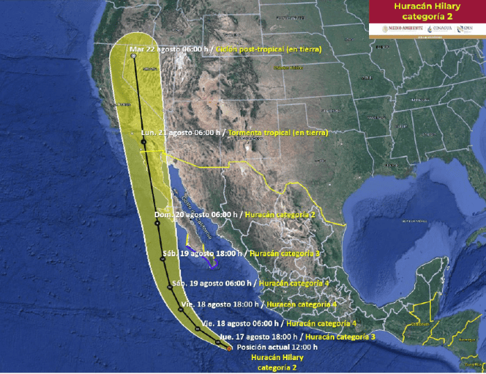 Esta mañana, "Hilary" alcanzó la categoría 2 en la escala Saffir-Simpson, pero de acuerdo al pronóstico elaborado por el Servicio Meteorológico Nacional (SMN), fuente oficial del Gobierno de México en materia climática, podría llegar al peligro nivel 4."Hilary" mantiene la categoría 2 como huracán este jueves y sus extensas bandas nubosas ocasionan lluvias de fuertes a puntuales intensas en estados del occidente, centro y sur de México; además de rachas fuertes de viento y oleaje elevado en costas de Jalisco, Colima, Michoacán y Guerrero.El pronóstico del SMN prevé que esta misma tarde, "Hilary" alcance la categoría 3 como huracán, cuando se encuentre a 570 kilómetros al suroeste de Playa Pérula, Jalisco, y a 595 kilómetros al suroeste de Cabo Corrientes, Jalisco.Pero sería mañana viernes 18 de agosto, cuando el ciclón tropical alcance la peligrosa categoría 4, que mantendría hasta el sábado, cuando se localice a 595 km al sur-suroeste de Cabo San Lucas, BCS, y a 660 km al oeste-suroeste de Cabo Corrientes, Jal.Al mediodía de este jueves 17 de agosto, el huracán "Hilary" se encuentra a 540 kilómetros (km) al suroeste de Playa Pérula, Jalisco, y a 805 km al sur-sureste de Cabo San Lucas, Baja California Sur; en su distancia al lugar más cercano en el territorio nacional.El desplazamiento actual del sistema es hacia el oeste-noroeste (300°) a 22 km/h, mientras tiene vientos sostenidos de 165 km/h y rachas de 205 km/h.Con información del Servicio Meteorológico Nacional y del Ministerio de Medio Ambiente de El SalvadorOA