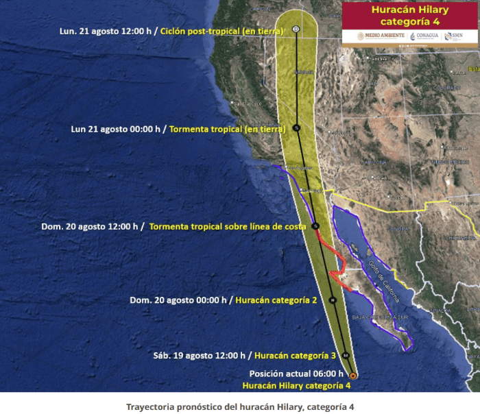 "Hilary" se mantiene como huracán de categoría 4 en la escala Saffir-Simpson, pero este mismo día comenzará a bajar su intensidad. Sus extensas bandas nubosas cubren el occidente y noroeste del país, generan lluvias muy fuertes a intensas, así como fuertes rachas de viento en dichas regiones y oleaje elevado en sus costas, por lo que Guadalajara no está fuera del pronóstico.Amanece parcialmente nublado, conforme avanza la mañana, incrementa la nubosidad y también la probabilidad de algún chubasco o tormenta eléctrica para la tarde y noche. Posibles rachas de viento de 30 km/h del sureste.El huracán categoría 4 "Hilary" mantiene su intensidad, sin embargo, en las próximas horas se internará en aguas más frías, por lo que se espera un rápido debilitamiento.La gran circulación de "Hilary" aporta humedad al noroeste de México, además, la combinación de canales de baja presión y el calentamiento de la tarde, así como el paso de una nueva onda tropical número, favorecerán precipitaciones con posibles descargas eléctricas y posible caída de granizo en las regiones noroeste, occidente, centro, sur y sureste de la República Mexicana.Con información del Servicio Meteorológico Nacional y del Instituto de Astronomía y MeteorologíaOA