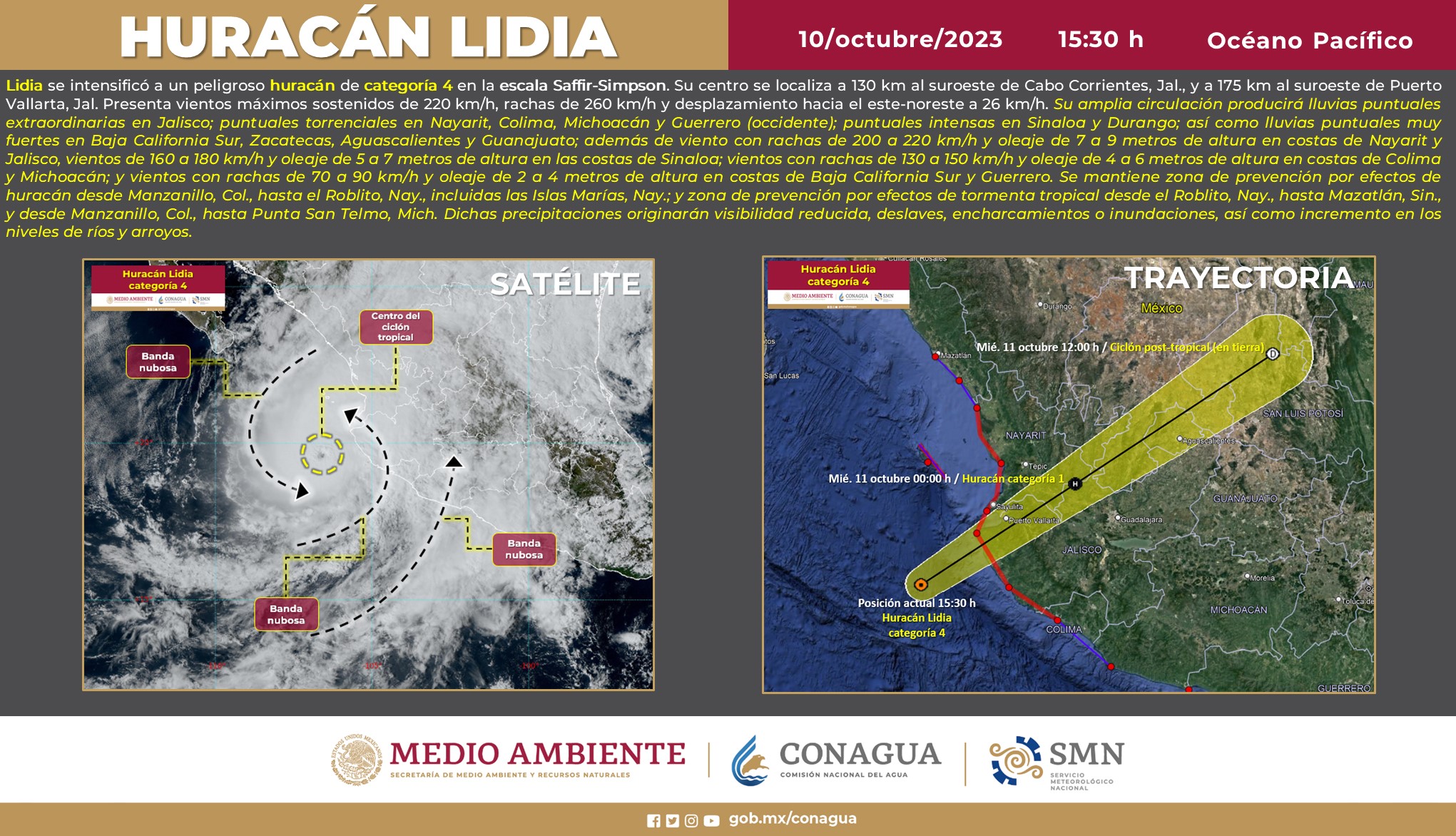 Protección Civil mantiene un operativo especial y ha desplegado alrededor de 70 elementos en las zonas con mayor riesgo de inundación en las costas Norte y Sur de Jalisco con motivo del impacto que pueda tener el huracán "Lidia" a lo largo de las zonas mencionadas.De acuerdo con la última actualización del Servicio Meteorológico Nacional (SMN), Lidia ha alcanzado la categoría 4 en la escala Saffir-Simpson y sigue incrementando sus vientos, lo que indica que refuerza las lluvias puntuales extraordinarias en Jalisco.En su reciente aviso SMN también destacó que apróximadamente entre las 18:00 y las 21:00 horas, el huracán este tocando tierra en las inmediaciones de Puerto Vallarta, Cabo Corrientes y Tomatlán. Hasta el momento se encuentra a 130 kilómetros (km) al suroeste de Cabo Corrientes y a 175 km al suroeste de Puerto Vallarta.La mañana de este martes se comenzó con evacuacion peventiva en las poblaciones de Chimo, Quimixto, Yelapa, Pizota y Corrales. A su vez se han habilitado 12 albergues temporales instalados en los siguientes puntos: En su comunicado, el Servicio Meteorológico Nacional solicita extremar precauciones a la población en general por lluvias, viento y oleaje (incluyendo la navegación marítima) y atender las recomendaciones emitidas por las autoridades del Sistema Nacional de Protección Civil, en cada entidad. YC