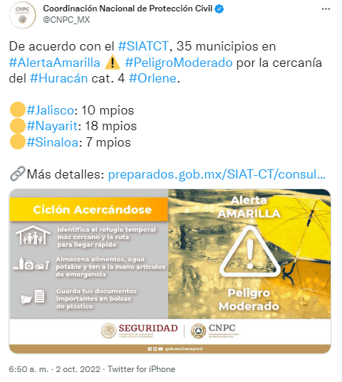 En su más reciente actualización, la Coordinadora Nacional de Protección Civil emitió alerta amarilla por el huracán "Orlene" en 35 municipios, 10 de ellos localizados en Jalisco.El huracán "Orlene" se ubica a 185 kilómetros al oeste-suroeste de Playa Pérula y a 195 km al suroeste de Cabo Corrientes, ambos ubicados en esta Entidad.El ciclón presenta un desplazamiento hacia el norte, a una velocidad de 11 km/h, y registra vientos máximos sostenidos de 215 km/h y rachas de 240 km/h.En Jalisco se emitieron tres alertas por el acercamiento del huracán "Orlene", estas son:El huracán "Orlene" se intensificó rápidamente a huracán de categoría 4 en la escala Saffir-Simpson, frente a las costas de Jalisco. Sus bandas nubosas producirán lluvias muy fuertes a puntuales torrenciales en el occidente del país, así como vientos fuertes y oleaje elevado en costas de dicha región.Piden extremar precauciones a la población en general en las zonas de los estados antes mencionados por lluvias, viento y oleaje (incluyendo la navegación marítima) y atender las recomendaciones emitidas por las autoridades del Sistema Nacional de Protección Civil, en cada entidad.En el sistema de alertas, estas significan:OF