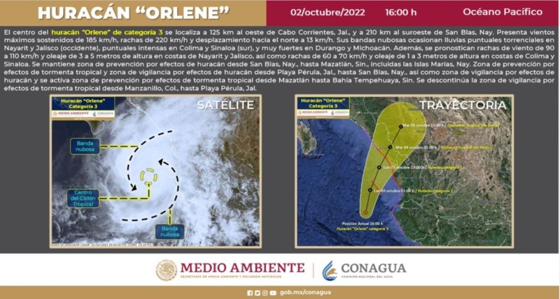 El gobernador de Jalisco informó quedebido al paso del Huracán "Orlene" de categoría 3 que pasará a 100 kilómetros de Cabo Corrientes se determinó suspender clases este lunes 3 de octubre.“Se han desplegado 300 oficiales operativos y distintas dependencias para prevenir ante cualquier contingencia, con especial atención en la Costa Norte y Costa Sur, en donde las navegaciones fueron suspendidas; así como monitoreo permanente en Sierra Occidental y Sierra de Amula”, publicó el mandatario en sus redes.Esta medida aplica para todos los niveles de educación básica, media superior y superior, confirmó la Secretaría de Educación Jalisco.La Universidad de Guadalajara también determinó la suspensión de actividades académicas en estos mismos municipios. El huracán "Orlene", actualmente de categoría 3, se ubica a 135 kilómetros al oeste-suroeste de Cabo Corrientes, Jalisco, con vientos sostenidos de 185 km/h con rachas de 220 km/h.Las bandas nubosas del huracán "Orlene", indica el Servicio Meteorológico Nacional (SMN), ocasionan lluvias intensas a puntuales torrenciales, vientos intensos y oleaje elevado en costas del occidente del país, incluido Jalisco. Las lluvias pronosticadas podrían originar incremento en los niveles de ríos y arroyos, deslaves e inundaciones en zonas bajas de los estados indicados.Además, la Unidad Estatal de Protección Civil y Bomberos de Jalisco invitó a la población de otros municipios a extremar precauciones y a mantenerse informados, frente a el paso de “Orlene” ya que las bandas nubosas de dicho fenómeno podrán traer consigo lluvias de moderadas a fuertes acompañadas de rachas de viento que pudieran ir de entre los 40 y 60 km/h.La Coordinación Nacional de Protección Civil del Gobierno Federal recomendó a residentes de zonas donde se acerca el fenómeno natural lo siguiente: • Evacuar zonas de riesgo y acudir al refugio temporal si tu vivienda no es segura. • Vigilar el nivel del agua si vives cera de un cuerpo de agua. • Cerrar puertas y ventanas y cortar el suministro de gas y electricidad. OF