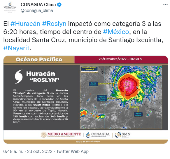 La Comisión Nacional del Agua (Conagua) informó que el huracán "Roslyn" de categoría 3 provocará lluvias intensas en el norte de Jalisco, Sinaloa, Durango, así como muy fuertes en Zacatecas, y fuertes en Colima. La Conagua alertó que estas lluvias pueden ocasionar deslaves e inundaciones en zonas bajas de las regiones antes mencionadas. "Roslyn" se encuentra actualmente a 90 kilómetros al noroeste de Tepic, Nayarit., y a 70 kilómetros al nor-noroeste de San Blas, Nayarit, lo que traerá lluvias torrenciales para este domingo en dicha entidad.También se pronostica vientos con rachas de 120 a 150 kilómetros por hora y oleaje de cinco a siete metros de altura con afectaciones de marea de tormenta en las costas de Nayarit y la costa norte de Jalisco.A las 06:20 horas de hoy domingo, el huracán "Roslyn" impactó como categoría 3 en la localidad Santa Cruz, municipio de Santiago Ixcuintla, Nayarit.Además, autoridades mantienen zona de prevención por efectos del huracán "Roslyn" desde Playa Pérula, Jalisco, a Escuinapa, Sinaloa, incluyendo las Islas Marías, Manzanillo, Colima, y Mazatlán. Finalmente, pidieron a la ciudadanía de estos estados extremar precauciones y atender las recomendaciones emitidas por las autoridades del Sistema Nacional de Protección Civil, en cada entidad.gc