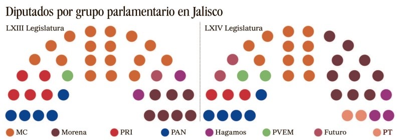 Ayer el Instituto Electoral y de Participación Ciudadana de Jalisco sesionó para validar la integración del Congreso de Jalisco para la LXIV Legislatura, donde la mayoría de las diputaciones se asignaron a la coalición de Morena, Partido del Trabajo, Verde, Futuro y Hagamos.Durante la sesión desarrollada se determinó que Morena y aliados sumarán 19 diputaciones, Movimiento Ciudadano tendrá 11, el PAN contará con cinco y el PRI con tres; esto de forma preliminar.Pablo Lemus Navarro se enfrentará a un Gobierno donde no tendrá el apoyo de la mayoría de las diputaciones, lo cual representa que para impulsar cualquier iniciativa de ley o de reforma, los diputados que representa Movimiento Ciudadano deberán emprender las negociaciones debidas que les permitan aprobar la mayoría que se necesita para ello. Al respecto el gobernador electo, Pablo Lemus, defendió que Movimiento Ciudadano por sí mismo obtuvo la mayoría de las diputaciones “sin considerar las alianzas” gracias al alto número de votos recibidos en la elección del pasado 2 de junio. Sin embargo, acentuó, en pleno respeto a la decisión de la ciudadanía que salió a votar, la coordinación y el diálogo se mantendrá también con las distintas fracciones y partidos, pues de lo que se trata es de generar consensos en favor de los jaliscienses. “En la parte legislativa, los jaliscienses decidieron elegir con otros colores y hay que respetarlo. También así será con nuestros senadores de la República, voy a dialogar con ellos para que lleven la representación de Jalisco a la máxima tribuna del país, también con nuestros diputados federales de todos los partidos políticos, porque necesito que me ayuden a conseguir, por ejemplo, más recursos para infraestructura para Jalisco, independientemente de su filiación partidista”.El politólogo Sandro Arreola consideró que esta situación revelará una nueva faceta para el gobernador electo, pues nunca había enfrentado una situación similar. “Esto lo mantenía siempre en un perfil de administrador, de alguien que comunicaba bien, que gobernaba bien. Pero ahora con la composición del Congreso estatal como se prevé que quede, sin que tenga una mayoría, sin duda lo pondrá a prueba como un negociador”, señaló el especialista. Además, explicó que en la Legislatura actual no se habían encontrado figuras con un arraigo tan fuerte a Morena y al proyecto de la “Cuarta Transformación”, lo cual permitió que el actual Gobierno lograra que los acuerdos resultaran a su favor. “Sin embargo, a la próxima legislatura llegan perfiles con mucho más arraigo a la Cuarta Transformación”, manifestó Sandro Arreola. Aunque intentaron sobrevivir sumándose a la “Mega alianza” conformada por Morena, el Partido del Trabajo (PT) y el Partido Verde Ecologista de México (PVEM) durante el Proceso Electoral 2023-2024, los partidos de reciente formación, Hagamos y Futuro, que recibieron su registro por el IEPC formalmente en septiembre de 2020, se quedarán sin registro ante el Instituto Electoral y de Participación Ciudadana (IEPC). De acuerdo con la Ley General de Partidos Políticos, una plataforma constituida puede mantener su registro oficial ante las autoridades electorales, y con ello recibir recursos públicos para su operación, siempre y cuando hubieran obtenido al menos el 3% de los votos totales recibidos en la última elección para diputaciones locales. Sin embargo, tras los comicios del pasado 2 de junio ni Hagamos ni Futuro lograron llegar al 3% de la votación en este sentido, pues de acuerdo con los resultados preliminares del Programa Electoral de Resultados Preliminares del IEPC, sólo consiguieron el 2.5% y 2.1%, respectivamente. Tampoco lograron llegar al 3% en las elecciones por la gubernatura. Ante su probable desaparición, a menos de cuatro años de haber sido formado, Hagamos, estaría dejando sin partido a alrededor de 26 mil personas afiliadas, y Futuro a otras 16 mil, según los registros presentados por dichas agrupaciones políticas. Diego Alberto Hernández, representante de Hagamos en el Pleno del IEPC, no contempla la desaparición de su partido, ya que faltan algunas etapas en el proceso electoral oficial. “Desde el partido no se ha previsto esa posibilidad, todavía faltan algunas etapas como las impugnaciones o, incluso, el finalizar con algunos cómputos, como el de munícipes, de donde podemos obtener el porcentaje mínimo para mantenernos con registro”, afirmó. Por su parte, el representante de Futuro, Mario Silva, afirmó que las votaciones para elecciones municipales aún no determinan los porcentajes para cada partido: “Además, derivado de distintas impugnaciones que habrá en el proceso electoral, van a modificarse el número total de votos de la elección, por lo cual aún no hay una determinación clara respecto de si se alcanza el 3% requerido por ley o no. Todavía no está definida esa situación”.El que pasó de panzazo una vez más fue el Partido Verde Ecologista de México que, en el caso de Jalisco, según los conteos preliminares, alcanzó el 4.6% de los votos.El Partido de la Revolución Democrática (PRD) y el Partido del Trabajo (PT) no pudieron recuperar votos en los pasados comicios. El PRD sólo alcanzó a obtener el 0.75% de los sufragios, mientras que el PT consiguió el dos por ciento. CT