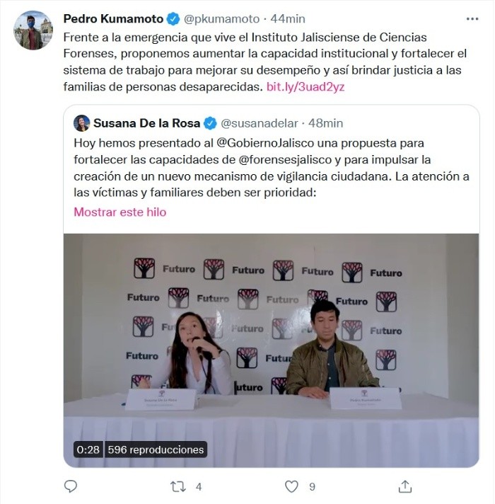 Luego de la publicación de este medio de comunicación ante la crisis en la que actualmente se encuentra el Instituto Jalisciense de Ciencias Forenses (IJCF) con cinco mil 738 cadáveres sin identificar, Pedro Kumamoto y la diputa local plurinominal del partido Futuro, Susana de la Rosa, enviaron una propuesta al gobernador del Estado para que en el 2022 se eleve el presupuesto del IJCF al menos 0.5 por ciento.Aseguran que la propuesta parte de un análisis del presupuesto actual y ofrece dos opciones de ajustes para poder implementar esta propuesta en 2022.Kumamoto destacó la importancia de ampliar la infraestructura, alcance y personal del Instituto.“Para fortalecer las capacidades institucionales de estas dependencias y mejorar su desempeño, en especial las del IJCF, proponemos aumentar el presupuesto de estas con el fin de ampliar su infraestructura y equipamiento, así como la contratación de personal adicional”, comentó el excandidato a alcalde de Zapopan por el partido Futuro.Por su parte, de la Rosa hizo un llamado a otras fuerzas políticas a que se sumen a la exigencia y espera que la autoridad estatal se sensibilice ante la actualidad del Instituto Jalisciense de Ciencias Forenses.“Solicitamos a las áreas correspondientes del Gobierno del estado que esta propuesta sea analizada y tomada en cuenta en el proceso de elaboración de la Iniciativa del Presupuesto de Egresos del Estado 2022 de manera previa a su presentación”, señaló.La propuesta destacó lo siguiente:“Como una medida inicial, proponemos que el presupuesto total de estas cuatro áreas y programas ascienda a, por lo menos, el 0.5% del presupuesto del estado. Aunque se identifica que el aumento para 2022 podría ser aún mayor, lo que ponemos también a consideración del Ejecutivo estatal”, señala el documento.También en la propuesta exigen que no se vuelva a repetir los hechos de los “tráilers de la muerte” que estuvieron circulando por parte de la Zona Metropolitana de Guadalajara y que marcaron a la ciudadanía.Si te interesó esta noticia y quieres saber más, entonces descarga y descubre INFORMAPlus, la aplicación digital de EL INFORMADOR, en donde tenemos contenidos exclusivos, seleccionados por nuestros editores, para darles una experiencia más completa a los lectores. Si eres suscriptor de EL INFORMADOR tu acceso está incluido, solicítalo al 33 3678-7777.Descarga la aplicación y pruébala GRATIS por treinta días.Para iOS: https://apple.co/35jaVgbPara Android: https://bit.ly/3gwVSEVJM