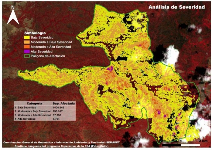 Dos mil 264.2 hectáreas afectadas dejo el incendio forestal registrado el pasado 06 de mayo, en el paraje conocido como Ciudad Cajetes, dentro del Área de Protección de Flora y Fauna (APFF) Bosque La Primavera, en el municipio de Tala.En un comunicado, el Gobierno de Jalisco reiteró que el fuego se originó por causas naturales al caer un rayo en la copa de un árbol. El siniestro se controló el 09 de mayo a las 10:00 horas y se reportó como liquidado el 10 de mayo a las 18:00 horas.Luego de la liquidación del incendio, la Secretaría de Medio Ambiente y Desarrollo Territorial (Semadet) realizó el análisis de la superficie afectada, así como el grado de severidad de la vegetación durante el incendio.Detalla que del polígono de afectación que abarca dos mil 873.5 hectáreas, en el 48.8 por ciento (mil 404.9 hectáreas) hubo baja severidad, en el 27.6 por ciento (793.3 hectáreas) una severidad de moderada a baja, en el 1.9 por ciento (57.3 hectáreas) una severidad de moderada a alta.Solo en 8.7 hectáreas hubo severidad alta y el resto de la superficie del polígono no tuvo afectaciones.Afirman que próximamente se realizarán valoraciones de campo para elaborar el reporte correspondiente y las medidas de recuperación del área.En caso de detectar algun incendio forestal, las autoridades piden reportarlo inmediatamente a las líneas: 33 3636 8252 (Centro Estatal de Incendios Forestales) / 800 INCENDIO. El seguimiento al combate de los incendios se puede consultar en la cuenta de Twitter @SemadetJal.NR
