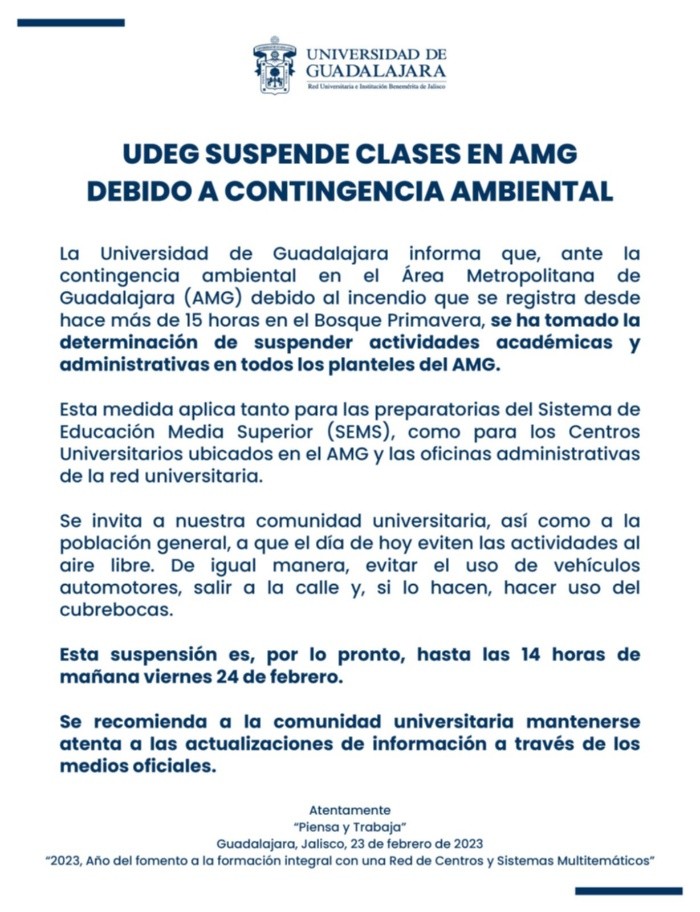 Debido a las condiciones atmosféricas en las que se encuentra el Área Metropolitana de Guadalajara, por el incendio registrado actualmente en el Bosque La Primavera, la Universidad de Guadalajara suspenderá clases presenciales en los planteles de la Metrópoli.Así lo dio a conocer este jueves el rector de la Casa de Estudios, Ricardo Villanueva, quien a través de sus redes sociales informó que la determinación fue tomada debido a las malas condiciones en la calidad del aire derivadas del incendio forestal, y luego de que se diera a conocer que se declaró Emergencia Atomosférica en Tala y 33 colonias de Zapopan, Guadalajara y Tlajomulco de Zúñiga.“Le recomendamos a nuestra comunidad y a la población en general, evitar actividades al aire libre e hidratarse, es momento de resguardarse en casa y de preferencia usar cubrebocas”, dijo Villanueva Lomelí.Esta medida aplica tanto para las preparatorias del Sistema de Educación Media Superior (SEMS), como para los Centros Universitarios ubicados en el AMG, donde se suspenderán clases desde la tarde de este jueves y, por lo pronto, hasta mañana viernes a las 14:00 horas.La comunidad estudiantil deberá permanecer alerta de las notificaciones de la UdeG a través de sus cuentas oficiales y medios de comunicación para conocer si se podrá volver a los planteles partir de la tarde de mañana o si la medida se extenderá hasta el fin de semana.Desde ayer miércoles, aproximadamente desde las 17:00 horas, se mantiene activo un incendio forestal en la zona conocida como Los Volcanes, del lado del municipio de Tala.En el combate del fuego participan más de 200 bomberas y bomberos forestales municipales, estatales y federales en busca de extinguirlo a la brevedad posible. También el gobernador de Jalisco suspendió las calses en 33 colonias de la Zona Metropolitana de Guadalajara. Consulta las colonias aquí