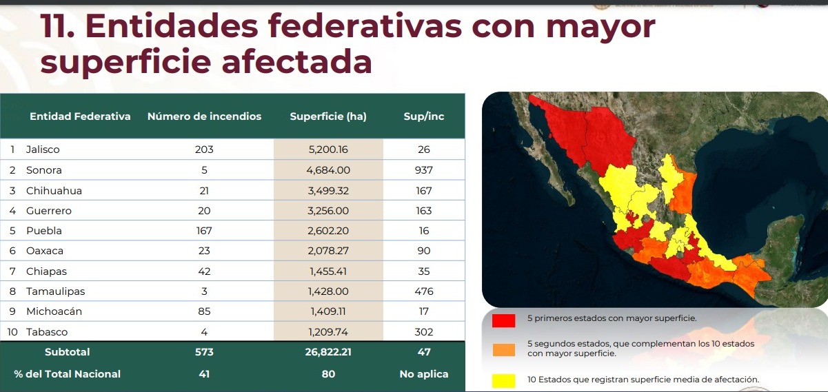 El Reporte Semanal de Incendios Forestales de la Comisión Nacional Forestal (Conafor), con cierre informativo el 16 de marzo, revela que Jalisco lidera las Entidades con mayor número de superficie afectada en este año, con cinco mil 200 hectáreas dañadas y 203 eventos.La dependecia refiere que en lo que va del año, se han registrado mil 385 incendios forestales en 30 entidades federativas, en una superficie de 33 mil 598.91 hectáreas.De esta superficie, el 96% correspondió a vegetación en los estratos herbáceo y arbustivo y el 4% a arbóreo. Las entidades federativas con mayor presencia de incendios fueron: Ciudad de México, Jalisco, México, Puebla, Tlaxcala, Michoacán, Veracruz, Chiapas, Morelos y Durango, que representan el 87 % del total nacional.Sin embargo, Jalisco encabeza las entidades con mayor superficie afectada. Después le siguen Sonora, Chihuahua, Guerrero, Puebla, Oaxaca, Chiapas, Tamaulipas, Michoacán y Tabasco, que representan el 80% del total nacional. El incendio del 22 de febrero en el paraje Los Volcanes en el Área Natural Protegida (ANP), del Bosque de La Primavera, fue el que más daño causó y por el que se emitió una contingencia atmosférica por parte del Gobierno Estatal.En este año 2023 los incendios forestales en Jalisco han afectado tres veces más a los bosques a causa del efecto climático de “La Niña” y el descuido humano.En la Zona Metropolitana de Guadalajara se han presentado más incendios en Zapopan, con 51 y en segundo lugar en Tlajomulco, con 17.Según reportes de Semadet, la temporada de estiaje se adelantó un mes y ha afectado primordialmente a municipios también de la región Valles de Jalisco como Tequila, Tala y Hostotipaquillo. La temporada más crítica se espera para abril y mayo que es cuando se elevan las temperaturas.Hasta ahora, el municipio con mayor afectación por fuego forestal es Tala, con mil 196 hectáreas quemadas, las cuales corresponden al Bosque de La Primavera.El incendio forestal ocurrido el 22 de febrero en el Área Natural Protegida (ANP) del Bosque de La Primavera, en el paraje “Los Volcanes,” habría sido intencional provocado por uno o varios hombres que prendieron fuego a llantas impregnadas de gasolina, así lo informó el Gobierno de Jalisco en la presentación del estado de fuerza para la temporada de estiaje 2023. En la presentación el Secretario de Medio Ambiente y Desarrollo Territorial (Semadet), Israel García destacó que el fuego afectó 500 hectáreas.Una de las primeras afectaciones de las llamas fue en el bosque de La Primavera, con un siniestro que duró más de 15 horas a principios de la temporada de estiaje y arrasó también con 500 hectáreas. Fue controlado en el paraje Latillas, en el municipio de Tala, con el apoyo de 100 bomberos de los tres órdenes de Gobierno y la asociación “Selva Negra”, así como 21 vehículos, entre pipas de agua y motobombas.La tarde de ayer iniciaron dos incendios forestales uno en el cerro del Colli, dentro del Área Natural Protegida (ANP) del bosque La Primavera, y otro en El Nixticuil.Brigadas de distintas corporaciones en el Área Metropolitana de Guadalajara combatieron las llamas; también utilizan aeronaves para realizar descargas de agua.