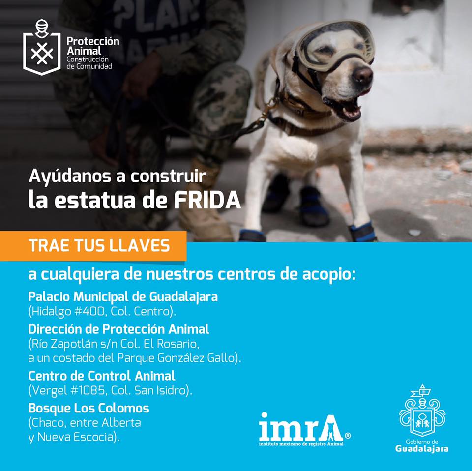 Este domingo dio inicio la recolección de llaves para la construcción de una estatua en homenaje a Frida, la perra rescatista que ayudó a la localización de personas tras los sismos ocurridos el pasado mes de septiembre en el centro del país.Organizada por la dirección de Protección Animal del Ayuntamiento de Guadalajara, la creación de esta estatua, se llevará a cabo como reconocimiento a Frida y a todos los binomios caninos que también participaron en la localización y rescate; será colocada en un nuevo parque canino que se ubicará en la colonia Monraz.Se espera que el parque quede construido a mediados de diciembre, temporalidad en la que también sería colocada la estatua una vez terminada, según explicó Merilyn Gómez, titular de la dirección de protección Animal.“El material para la escultura que estará en Guadalajara fue donado por el instituto Mexicano de Registro Canino. La escultura está ya casi terminada pero hacemos esta recolección en un tema simbólico para que los tapatíos sientan que están participando en la construcción de ella”, dijo la directora.Durante este domingo la recolección de llaves se llevará a cabo en el bosque Los Colomos, por la entrada de la calle El Chaco, en el marco del evento “Bazar La Mirilla”. A partir del lunes, serán recibidas en el Ayuntamiento de Guadalajara, en el centro de Control animal de la calle Puerto Melaque y en la propia dirección de Control Animal en el parque González Gallo, hasta las 5 de la tarde.“Ojalá que la gente lo pueda ver más allá de una estatua a Frida nada más, que sea un espacio que se está ganando para el respeto y la inclusión de todos los animales y especialmente para todos los perritos”, finalizó la directora.El datoLa escultura ya se encuentra en proceso de creación en la Ciudad de México, por el escultor Marco Antonio Jasso, especialista en bustos y monumentos con más de 35 años de trayectoria, quien ha elaborado distintas obras para los gobiernos de México, Guanajauato, Colima, Tlaxcala y Cancún.