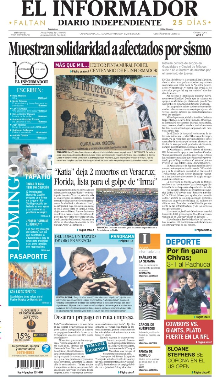 Con pintura de diversos colores para interiores y exteriores, el maestro Pedro Contreras realizó un mural de la primera portada de EL INFORMADOR, en el andador de Talia 80, en la Colonia Lomas de Independencia.“Vivíamos en Ahualulco y desde hace 50 años mi padre comenzó a comprar este periódico. De alguna manera estábamos interesados en la lectura, porque él nos decía que la lectura siempre es la base del conocimiento. Nos ponía a leer a mis hermanos y a mí EL INFORMADOR”, contó mientras mostraba la portada original del periódico, fechada el 5 de octubre de 1917, la cual recibió como un regalo desde hace varios años.El hombre llegó a vivir a la metrópoli para enseñar la materia de Ciencias Sociales en una escuela del nivel primaria. Ahora que está jubilado quiere seguir compartiendo su conocimiento con los niños y niñas. “Con este mural busco invitar a todos los niños y jóvenes a leer... que lean principalmente las revistas, los libros y los periódicos”.Hasta recomienda que estos sectores de la población eviten pasar tanto tiempo en la televisión y hasta Internet. “No se debe estar tanto tiempo en la televisión y el WhatsApp. En los libros y diarios está la base del conocimiento... en la lectura”.Explicó que pidió permiso para hacer varios murales en el andador, los cuales estaban llenos de rayas sin sentido. “Los jóvenes respetan el espacio que ven pintado y los niños se acercan a ver qué hay aquí”."Termino la primera portada de El Informador y después sigo con el centenario de la Constitución. Vamos a tratar de hacer con algunos personajes que vienen en el billete de 100 pesos el nuevo, agregando a los precursores de los artículos 27, 123 y tercero, la base de las garantías sociales por las que luchó Zapata".Pedro Contreras, quien pintó en el andador Talía de la Colonia Independencia un mural de la primera portada de EL INFORMADOR, es lector del periódico desde hace 50 años, cuando su progenitor lo ponía a leerlo a él y a sus hermanos.A pesar de que ha leído a otros diarios locales, consideró que el periódico que está por cumplir su centenario es el más responsable en su ejercicio. “Se me hace el más completo y verídico. Primero por la tradición de mi padre y otra por las personas que escriben en él, además de columnistas como Jaime García Elías y Diego Petersen, sus comentarios me parecen más acertados, le dejan a uno el campo preparado para seguir buscando información”.De las secciones del periódico su favorita es la deportiva debido a que el futbol y el atletismo son sus pasiones. “También la sección de noticias para ver los sucesos importantes, hace poco me di a la tarea de buscar un suceso importante en marzo 14 de 1933 sobre el incendio de un cine en Ahualulco, llamado cine Hidalgo, donde murieron alrededor de 50 personas y es la tragedia más grande que ha habido en Ahualulco”.Pedro Contreras pinta murales frente a su casa, ubicada en el andador de Talia 80 de la colonia Lomas de Independencia, motivado por compartir un poco de historia a los niños que asisten a una escuela cercana. En esas memorias decidió plasmar la primera portada que se imprimió de EL INFORMADOR, el 5 de octubre de 1917.“Me motivó el Centenario de La Constitución, y pensando en eso decidí hacer otros dos centenarios que se cumplen este año: El de EL INFORMADOR, y el otro es en relación a un club a nivel de aficionados que en octubre cumple cien años también”.Su pasión es enseñar, pero el hombre que nació en Ahualulco de Mercado, la mezcla con su gusto por hacer murales. “Quería mandar un mensaje a los niños que salen del colegio, que recuerden algo de su historia, lo que nos comentaba el escritor Juan José Arreola que una persona que no conoce su pasado no tiene identidad, es algo que se está perdiendo, la identidad como mexicanos. Un mensaje de ayudar a la niñez a recordar su identidad sus orígenes”, dijo el profesor.Este artículo forma parte de la edición conmemorativa de los 100 Años de EL INFORMADOR. El resto de los contenidos especiales están disponibles en ESTE ESPACIO y también puedes consultar la versión hojeable digital PULSA AQUÍ.