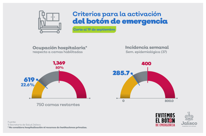 Con la disminución en el número de pacientes hospitalizados y la baja en la incidencia de contagios de COVID-19 por cada millón de habitantes, el Gobierno de Jalisco descartó aplicar el “botón de emergencia” para retomar medidas restrictivas de actividades.Según lo publicado por el gobernador en redes sociales, hasta el sábado había 619 personas hospitalizadas por el virus, lo que representa ocupación hospitalaria de 22.6%, la semana pasada se notificaron 642 pacientes internados (23.4%). En este parámetro no se considera la ocupación en hospitales privados.En lo referente a la tasa de incidencia, se ubicó en 285.7 casos por millón de habitantes, en la anterior medición era 315.9 contagios. “No podemos aflojar el ritmo ni un solo día para cuidar a los nuestros y a nuestro personal médico, así como para salvar vidas y seguir reactivando a nuestra economía. Evitemos el #BotónDeEmergencia, sigamos dando pasos hacia delante”, escribió el titular del Poder Ejecutivo estatal. Según los criterios estatales el botón de emergencia se aplicaría y volverían las medidas restrictivas, en caso de que se alcance ocupación hospitalaria de 50%, es decir mil 369 camas; o si se registra una tasa de incidencia de 400 contagios por millón de habitantes. IM