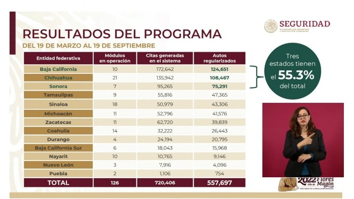 La titular de Seguridad y Protección Ciudadana (SSPC), Rosa Icela Rodríguez Velázquez, anunció que se han regularizado 557 mil 697 vehículos de procedencia extranjera que se encontraban de manera irregular en nuestro país.Al presentar el Informe Mensual de Seguridad, la funcionaria señaló que con este programa se ha logrado recaudar mil 394 millones de pesos y resaltó que el día de ayer se publicó el decreto presidencial para que el programa se amplíe hasta el 31 de diciembre. Asimismo, anunció que el estado de Jalisco ya se sumó al programa."Este programa se inicia por instrucción del señor Presidente, se aplica para modelos 2016 para atrás que ya están en nuestro país. Este programa tiene tres objetivos: dar certeza jurídica y patrimonial a las familias en la propiedad de sus vehículos; dos, sacar del anonimato a los vehículos extranjeros que son usados en la comisión de los delitos. Aproximadamente el 80% de las unidades que son empleadas para cometer delitos no tiene un registro apropiado. Ahora tiene rostro nombre, domicilio del propietario y están inscritos en el Registro Público Vehicular (Repuve).»¿Para qué se emplean los recursos obtenidos? Recordar que también por instrucción del presidente se ocupan en bacheo de las calles de los estados que están incorporados en esta actividad, para ello se considera un pago de 2 mil 500 pesos por vehículos y se ocupa para el bacheo de las calles de estos estados”.Frente al Presidente de la república, añadió: "Este programa se llevó a cabo del 19 de marzo al 19 de septiembre. Se instalaron 126 módulos en estos 13 estados y se tienen un resultado, me da mucho gusto informar, de 557 mil 697 vehículos regularizados hasta el día de ayer. Nosotros nos habíamos comprometido con 500 mil para el 19 de septiembre, rebasamos la meta y hay que agradecer a los 13 estados beneficiados (…) Aquí están los recursos que se obtuvieron con esta medida: mil 394 millones de pesos que se tiene al 19 de septiembre".En Palacio Nacional, la titular de Seguridad y Protección Ciudadana señaló que debido a la demanda que ha tenido el programa, ayer se publicó el decreto por el que se extiende el proyecto hasta el 31 de diciembre. También anunció la integración de Jalisco.Explicó que los tres estados que tuvieron mayor índice de autos regularizados son Baja California, Chihuahua y Sonora, los cuales suman el 55.3% del total."El anuncio que por instrucción del presidente es que dado la demanda de más citas, ayer en la tarde se publicó el decreto que amplía el plazo del programa al 31 de diciembre, y además también por instrucción del señor presidente se agrega el estado de Jalisco a la lista donde habrá módulos de atención", añadió.Con la incorporación de Jalisco a este programa, en el estado ya se podrán regularizar estos "autos chocolate". MS
