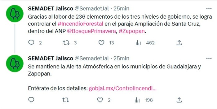 Cerca del mediodía de este lunes, el gobernador de Jalisco y la Secretaría de Medio Ambiente y Desarrollo Territorial (Semadet) informaron que el incendio ubicado en el Área Natural Protegida del Bosque la Primavera que inició el pasado domingo ya ha sido controlado.El siniestro en el ejido de Santa Cruz empezó aproximadamente a las 16:00 horas de ayer, y en aquel momento tuvo la intervención de los elementos del Organismo Público Descentralizado del Bosque de la Primavera. Sin embargo, tras las complicaciones para controlar el fuego, las labores se extendieron a más de 20 horas de trabajo y la suma de un total de 236 elementos de los tres órdenes de gobierno, 42 vehículos especializados, dos ambulancias y tres helicópteros.Por medio de su cuenta de Twitter el mandatario estatal agradeció el esfuerzo de los integrantes que combatieron el fuego, que en suma pertenecen a Semadet, Conafor, Sedena, CFE, elementos de la OPD del Bosque de la Primavera, Protección Civil y Bomberos de Jalisco, Zapopan, Guadalajara, El Arenal e incluso organizaciones civiles y voluntarios capacitados.De acuerdo con la Secretaría de Medio Ambiente de Jalisco, la alerta atmosférica decretada ayer a las 21:00 horas para los municipios de Guadalajara y Zapopan permanecerá hasta que el incendio sea extinguido en su totalidad con el propósito de salvaguardar la salud de la ciudadanía.En el sitio del incendio permanecen hasta el momento 126 bomberos forestales de los tres niveles de gobierno, con apoyo de 35 vehículos especializados y el helicóptero Witari de la Secretaría de Medio Ambiente Jalisco para realizar labores finales de extinción y enfriamiento de la zona.Durante las labores de combate, hubo un saldo de dos bomberos pertenecientes a la OPD Bosque La Primavera que fueron alcanzados por las llamas y resultaron lesionados con quemaduras de primer y segundo grado en el 10% de su superficie corporal, afortunadamente no hubo daño a en sus vías aéreas.Ambos fueron trasladados en condición estable por medio del helicóptero Corsario y el Sistema de Atención Médica de Urgencias (SAMU) de la Secretaría de Salud Jalisco (SSJ) al IMSS de Tala.Históricamente, durante el mes de abril y mayo es cuando hay más presencia de incendios forestales, por lo que en caso de detectar incendios forestales es necesario reportarlo inmediatamente a las siguientes líneas: 33 3636 8252 (Centro Estatal de Manejo del Fuego), 800 737 00 00 y 911.El seguimiento al combate de los incendios se puede consultar en la cuenta de Twitter @SemadetJal. La calidad del aire en tiempo real se encuentra disponible en el sitio: gobjal.mx/calidadaire y a través de la cuenta de Twitter @AireySaludAMG. JM