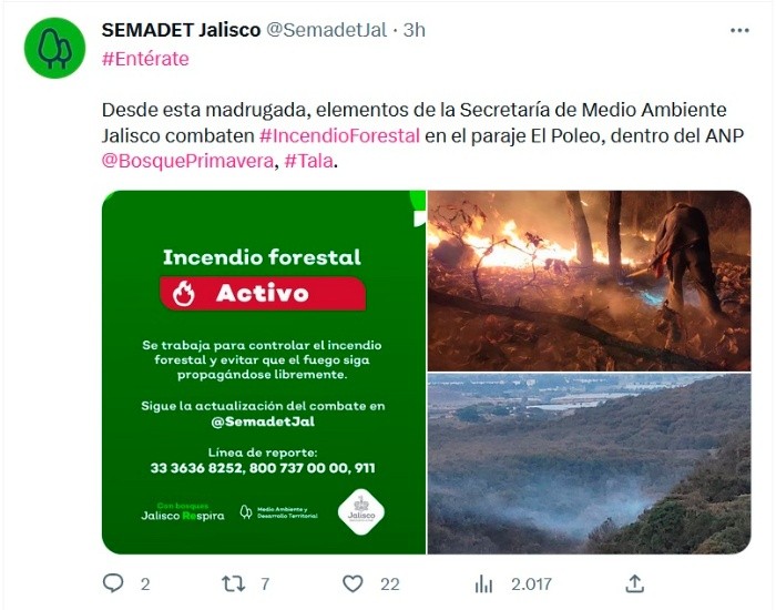 A través de redes sociales, la Semadet reportó un nuevo incendio en progreso en el Área Natural Protegida (ANP) Bosque La Primavera. A las 7:44 horas, la dependencia detallaba que los elementos se encontraban combatiendo las llamas, aunque sin dar mayores detalles sobre el avance de las labores.De acuerdo con el comunicado, elementos de la Semadet se encuentran realizando las labores en el paraje El Poleo, dentro del municipio de Tala, y que se encuentra en el ANP. A través de su cuenta de Twitter, la Semadet informó que el incendio había sido controlado.“Se reporta controlado el incendio forestal en el paraje El Poleo / Llano Grande, dentro del ANP del Bosque de La Primavera”, dice el tuit.En este sentido, al estar controlado el incendio el riesgo de propagación es mínimo; y los brigadistas continúan con labores de enfriamiento y extinción.Cualquier incendio forestal se puede reportar a la Semadet, a los teléfonos 33 3636 8252, 800 737 00 00 y al 911.JM