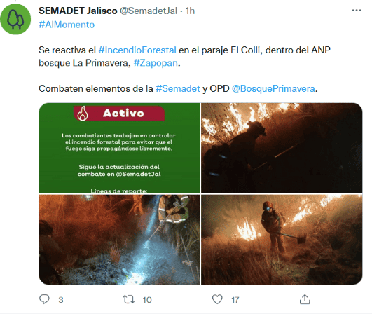 Pese a que desde ayer en la noche se declaró controlado, esta mañana el fuego se reactivó en el paraje El Colli, dentro del Área de Protección de Flora y Fauna del Bosque La Primavera.De acuerdo con Protección Civil y Bomberos de Zapopan, hubo reignición en dos puntos por las condiciones de viento en la madrugada, una vez que se había declarado controlado.Cuatro brigadas de la institución, así como brigadas del OPD Bosque La Primavera y la Secretaría de Medio Ambiente y Desarrollo Territorial (Semadet) trabajan en esos puntos.Alrededor de las 8:30 - 9:00 de la mañana se retomaron las descargas con la aeronave Tláloc.Desde ayer, elementos de distintas corporaciones combaten cinco incendios forestales de manera simultánea: tres en Zapopan, uno en Tala y uno en Ixtlahuacán del Río.En el Cerro del Tepopote, uno de los que se encuentran en Zapopan, se sigue trabajando.GC