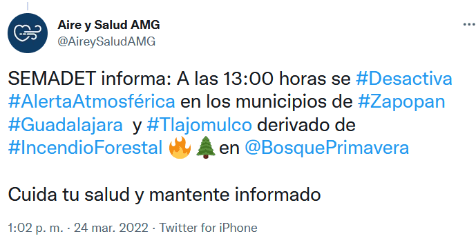 Luego de 24 horas de labores quedó liquidado el incendio que comenzó ayer pasadas las 13:00 horas en el paraje Bajío Las Milpillas, ubicado en el Área Natural Protegida del Bosque La Primavera.Así lo informó a las 13:30 horas el gobernador de Jalisco, quien informó además que quedó desactivada la alerta atmosférica declarada ayer para Guadalajara, Zapopan y Tlajomulco.“Ahora comienzan los análisis del daño y la estrategia para su restauración. Todo mi reconocimiento a las y los 320 brigadistas de los tres niveles de Gobierno que, sin descanso, arriesgaron todo por nuestro patrimonio natural”, expresó el mandatario estatal en sus redes sociales.Para evitar, en medida de lo posible que vuelvan a registrarse incendios dentro del Bosque, añadió, el modelo de vigilancia en 17 rutas seguirá para, como en este caso, “detener a quien intente atentar contra nuestros bosques y nuestro futuro”.En el incendio, liquidado a las 13:00 horas de este jueves, se trabajó con 76 unidades (pipas, motobombas, ambulancias, bombas de agua y camionetas Pick Up), y en apoyo aéreo seis helicópteros: Witari de Semadet; el Corsario de Secretaría de Seguridad Jalisco; Tláloc y Halcón de Zapopan; Palomo de Tlajomulco de Zúñiga y Zeus de Guadalajara.Hasta el momento se estima una afectación preliminar de 280 hectáreas, “sin embargo se realizará un análisis de severidad para determinar los niveles de afectación y generar una estrategia de recuperación y restauración de suelos adecuada”, añadió el gobierno de Jalisco.En el combate del incendio participaron 320 brigadistas forestales de la Secretaría de Medio Ambiente y Desarrollo Territorial (Semadet), el Organismo Público Descentralizado (OPD) Bosque La Primavera, la Unidad de Protección Civil y Bomberos de Jalisco, Zapopan, Guadalajara y Tlajomulco de Zúñiga, la Comisaría de Seguridad Pública del Estado, Zapopan y Guadalajara, Brigada 249, el municipio de Tala, la Comisión Nacional Forestal (Conafor), la Secretaría de la Defensa Nacional (Sedena), y la Guardia Nacional, así como Servicios Médicos de Zapopan y Guadalajara.En caso de detectar incendios forestales, reportarlo inmediatamente a las siguientes líneas: 33 3636 8252 (Centro Estatal de Incendios Forestales), 800 737 00 00 y 911. El seguimiento al combate de los incendios se puede consultar en la cuenta de Twitter @SemadetJal.GC