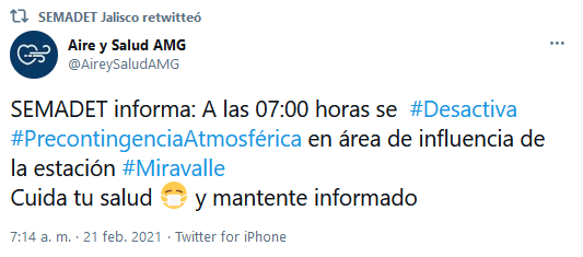 Tras más de 12 horas de registrar altos niveles de polución, la Secretaría de Medio Ambiente y Desarrollo Territorial (Semadet) desactivó la mañana de este domingo la contingencia atmosférica fase 1 en las zonas de influencia de las estaciones de monitoreo Santa Fe y Las Pintas.La dependencia estatal activó las contingencias la tarde del sábado debido a que las estaciones de monitoreo de la calidad del aire antes mencionadas registraron niveles superiores a los 150 puntos IMECA (Índice Metropolitano de la Calidad del Aire), aunado a las condiciones meteorológicasEn un comunicado se informó que la desactivación se dio luego de que, por más de dos horas consecutivas, se registraron niveles por debajo de los 140 puntos IMECA, además de que se llevó a cabo una verificación de las condiciones meteorológicas para constatar que favorecen la dispersión de contaminantes.Además, se mantienen en fase de precontingencia en la estación Santa Fe, donde continúa la mala calidad de aire con valores arriba de los 120 puntos IMECA.Las autoridades recordaron que la mala calidad del aire provoca afectaciones a la salud, especialmente entre grupos vulnerables como: niños menores de 5 años, personas con enfermedades respiratorias crónicas y adultos mayores.GC