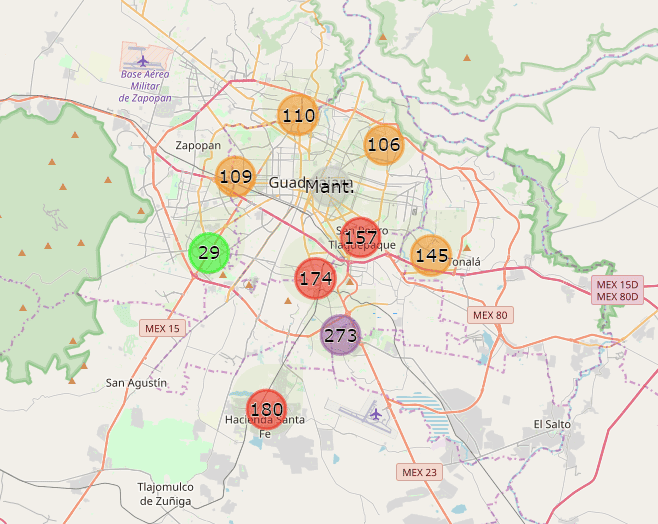 Este martes, en el reporte de las 09:30 horas, el Sistema de Monitoreo Atmosférico de Jalisco dio a conocer en sus redes sociales que la calidad del aire en la Zona Metropolitana de Guadalajara (ZMG) ha sido mala en Navidad.Según los registros del SIMAJ, el nivel máximo registrado es de 273 puntos IMECA en la estación de Las Pintas, por lo que se decretó Contingencia Ambiental Fase II; otros picos altos se reportan en las estaciones Miravalle, con 174 puntos; Miravalle y Tlaquepaque, con 174 y 157 respectivamente, y por ello se estableció la Contingencia por partículas suspendidas Fase I; en Loma Dorada, Atemajac, Vallarta y Oblatos, con 145, 110, 109 y 106 puntos IMECA se decretó Precontingencia; solo en la estación de Las Águilas se han registrado mejores condiciones, con apenas 29 puntos.Estas condiciones ambientales podrían causar molestias en niños, adultos mayores y personas con problemas respiratorios, por lo que piden a la población a no realizar actividades al aire libre.Además, sugieren evitar cualquier tipo de quema, reducir el uso del auto y preferentemente emplear cualquier medio de transporte público, cerrar puertas y ventanas que dejen ingresar los contaminantes a espacios cerrados, utilizar cubrebocas en caso de padecer alguna enfermedad respiratoria, y fortalecer las defensas consumiendo frutas y verduras.Los altos niveles de contaminación en la ciudad reportan un alza en estas fechas, debido al uso de pirotecnia y encendido de fogatas por las celebraciones por Nochebuena y Navidad.Para mayor información, invitan a consultar las publicaciones de la SIMAJ a través de su cuenta de Twitter.OF