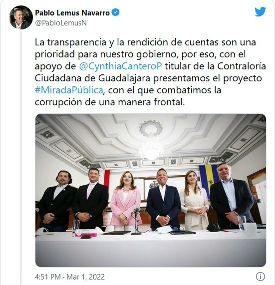 A fin de promover la participación ciudadana en la supervisión de la administración pública, la Contraloría de Guadalajara en coordinación con el Instituto Nacional de Transparencia y Acceso a la Información (INAI) y el Gobierno Municipal de Guadalajara, lanzaron este martes la plataforma digital Mirada Pública.En esta fase inicial la contralora ciudadana de Guadalajara, Cynthia Cantero Pacheco, informó que este proyecto le permitirá a los ciudadanos acceder a información en temas como seguridad, corrupción, desigualdad, calidad de vida, calidad de servicios públicos, adquisiciones y auditorías para la toma de decisiones.“Nuestro objetivo es colocar al ciudadano al centro de las decisiones públicas, en el control y vigilancia de su autoridad, para que incida de forma directa en los temas que le preocupan a la sociedad, seguridad, corrupción, desigualdad, calidad de vida, calidad de servicios públicos. Con Mirada Pública atendemos y hacemos efectivas las reformas anticorrupción en nuestro país, que reconfiguran a los órganos internos de control, hacia el establecimiento de mecanismos y herramientas que combatan la corrupción”, declaró.Cualquier persona puede acceder a este modelo a través del micrositio www.miradapublica.guadalajara.gob.mx, en el que encontrará información derivada de las licitaciones de infraestructura pública como el proceso de obras en el municipio, compras relacionadas con las etapas de planeación, licitación, adjudicación, contratación y ejecución de algún proyecto. De igual manera incluirá un padrón de inspectores con sus datos de fotografías, nombres, credencial y giros de los que se encargan, así como un espacio para calificar el servicio que brindan los inspectores.Por su parte el presidente municipal de Guadalajara, Pablo Lemus Navarro, señaló que respalda la ejecución de este modelo de la contraloría municipal, el cual tiene autonomía.“Yo no puedo darle indicaciones, ni debo, ni lo quiero hacer, del trabajo que hace. Qué hacer o qué no hacer, no está dentro de mis atribuciones. Son puertas abiertas. Lo que quieran indagar, investigar, y no solamente para el hoy o para el mañana, sino también para el ayer. Puertas abiertas absolutamente a todo su trabajo”, expresó.JM