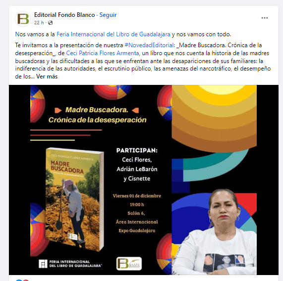La líder del colectivo Madres Buscadoras de Sonora, Ceci Patricia Flores Armenta, presentará su libro "Madre Buscadora. Crónica de la desesperación" en la Feria Internacional del Libro (FIL) Guadalajara."En este libro se relata su historia: la de una madre que, sorteando todo tipo de adversidades, ha tenido que remover las tierras de varios sitios para encontrar algún indicio que le permita encontrar a sus dos hijos desaparecidos por cárteles mexicanos, lo que la ha llevado a desenterrar más de 2 mil cadáveres de las fosas clandestinas de todo el país".La presentación se realizará el viernes 1 de diciembre a las 19:00 horas en el Salón 6 del Área Internacional de la FIL, en la Expo Guadalajara. En el evento participará Ceci Flores, Adrián LeBarón y Cisnette.Desde 2019, Ceci Flores busca a sus hijos Marco Antonio y Alejandro. Desde entonces se ha convertido en una activista al líder del colectivo Madres Buscadoras de Sonora, localizar miles de fosas clandestinas en distintos estados.Mantente al día con las noticias, únete a nuestro canal de Whatsapp.MM