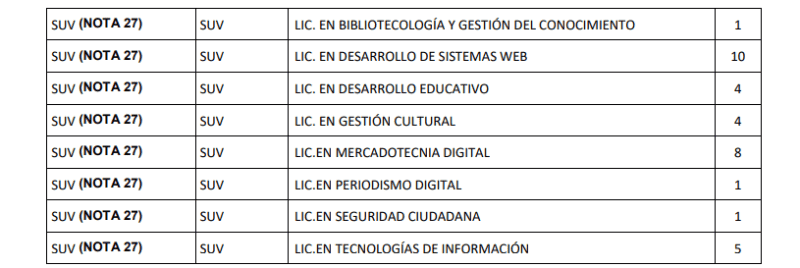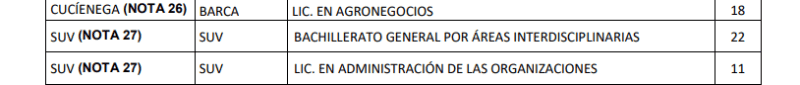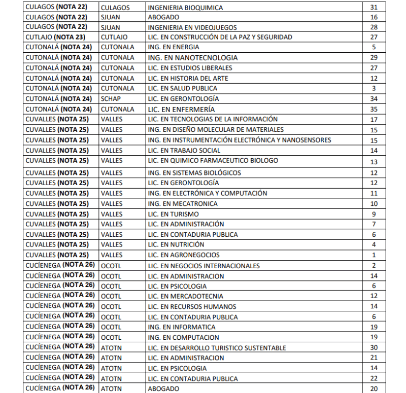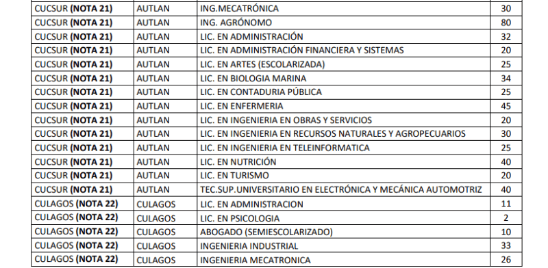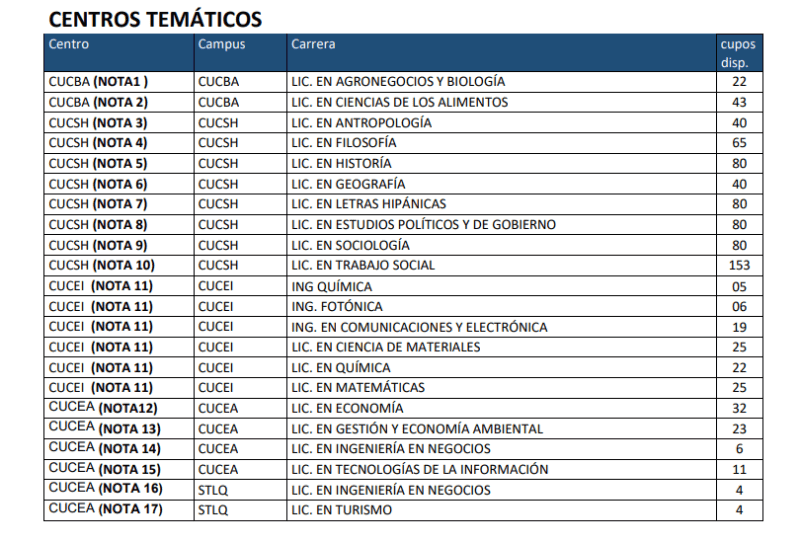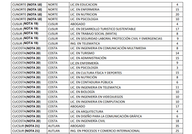 Hoy lunes 8 de enero, la Universidad de Guadalajara (UdeG) publicó su dictamen de admisión a las escuelas preparatorias y centros universitarios para el calendario 2024-A, y en caso de que no hayas salido en listas, ya pusieron a disposición aquellas carreras y centros universitarios con cupos disponibles.En un comunicado, la UdeG señala que si no fuiste admitido a la carrera que aspiras y concluiste tus trámites para este calendario, se ofrecen mil 788 lugares en las siguientes licenciaturas y sedes:Para aspirar a uno de estos lugares disponibles en centros universitarios, deberás continuar con estos lineamientos:Para saber más sobre las aspiraciones a ciertos centros universitarios, consulta este enlace.*Mantente al día con las noticias, únete a nuestro canal de WhatsAppOF