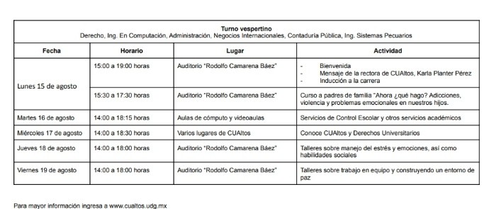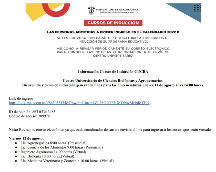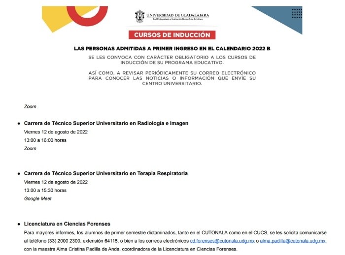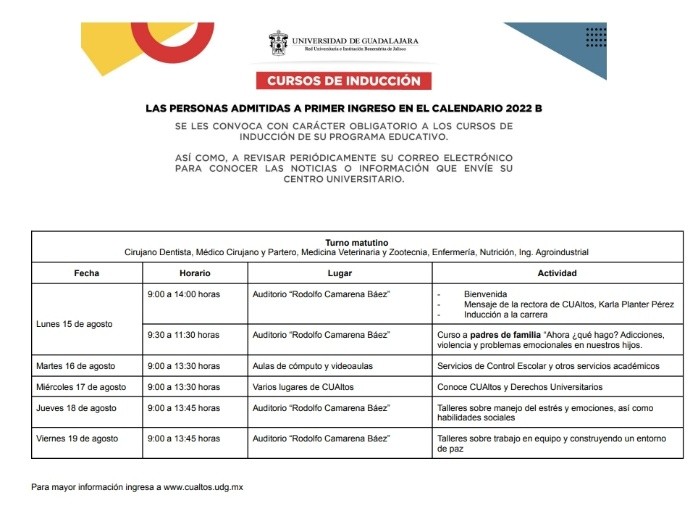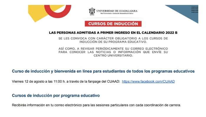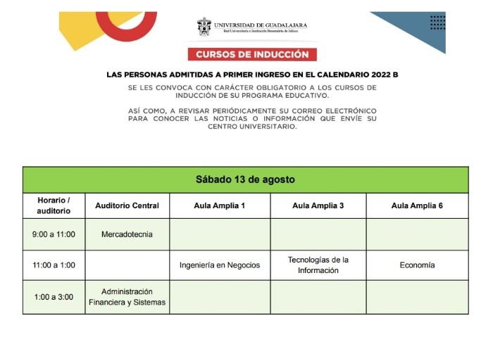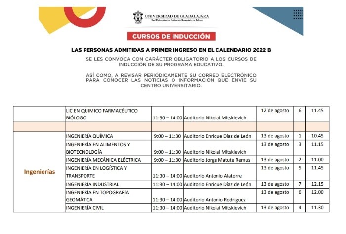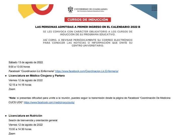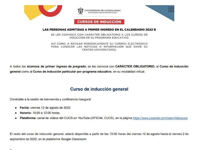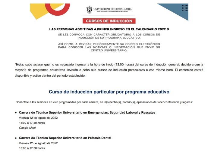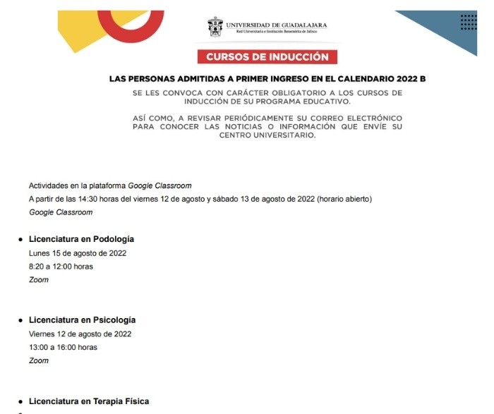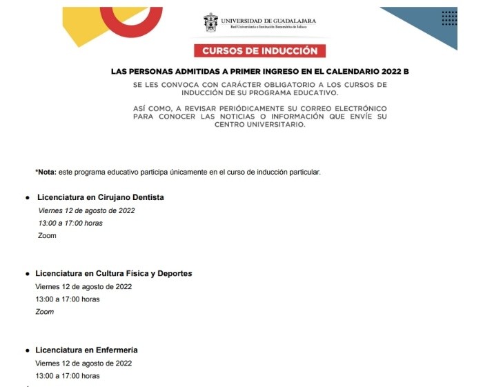 Hoy jueves 11 de agosto se dieron a conocer las listas de admisión de la Universidad de Guadalajara (UdeG) para preparatorias y licenciaturas del calendario 2022-B. Si fuiste admitido, además de conocer tu resultado, debes saber que cada centro universitario ofrece un curso de inducción, incluso algunos comienzan el mismo 11 de agosto por la tarde.Para que no se te pasen, aquí te dejamos las fechas y los horarios de los cursos de cada centro univerisitario. La Universidad de Guadalajara ha puesto a disposición de los admitidos la página: http://www.gaceta.udg.mx/cursosinduccion2022b/, donde pueden consultar detalles sobre los cursos de inducción de cada carrera.MM