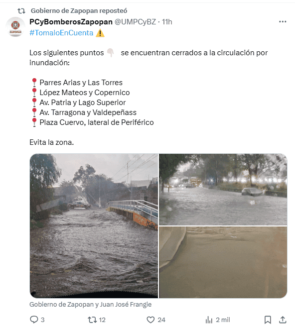 Durante la tarde-noche del jueves 12 de junio una fuerte tormenta, acompañada de actividad eléctrica y granizo en algunas zonas, azotó el Área Metropolitana de Guadalajara (AMG), dejando diversas afectaciones a su paso. Calles inundadas, cortes de luz y caída de árboles son parte de los efectos que esta lluvia tuvo en la ciudad.La Secretaría de Transporte Jalisco informó de la suspensión de servicio de Mi Macro Calzada por la caída de árboles en los cruces con Revolución y con Bicentenario, por lo que el carril quedó obstruido. Además, se presentó inundación en la zona del Parque Agua Azul.Por otro lado, elementos de la Policía Vial Jalisco acudieron al cruce en Calzada Lázaro Cárdenas y av. 8 de Julio, en donde realizaron labores para quitar un árbol que cayó y obstaculizó uno de los carriles.Usuarios en redes sociales reportaron que hubo cortes de luz en las colonias Americana y Santa Tere tras la lluvia de este jueves.Otra de las zonas afectadas por encharcamientos fue el cruce de Paseo de los Artistas con Avenida Normalistas.El Gobierno de Zapopan informó que la Unidad de Protección Civil y Bomberos, con el apoyo de la Policía de Zapopan, las direcciones de Parques y Jardines y Mejoramiento Urbano atendieron distintos reportes derivados de la lluvia.Entre los servicios de emergencia que atendieron se encuentran: árboles caídos, inundaciones en vía pública y casa habitación, vehículos afectados, arrastre de sólidos, postes y cables caídos.Protección Civil y Bomberos de Zapopan dijo que debido a inundaciones, no fue posible la circulación en diversos puntos del municipio, por lo que recomendaron evitar las zonas:Por su parte, la Policía Vial de Jalisco dijo que sobre la avenida López Mateos se realizaron labores en los siguientes puntos:Además, en redes sociales circula un video en el que un vehículo es arrastrado por la corriente en la calle Tarragona, en Lomas de Zapopan, a un costado del Auditorio Telmex. Las zonas de Valle, López Mateos y la cabecera municipal de Tlajomulco de Zúñiga resultaron afectadas por la caída de siete árboles y el riesgo de que otros dos se derribaran por los fuertes vientos de la tormenta de ayer. El cuerpo de emergencia del municipio atendió los reportes. Hasta el momento, las autoridades de otros municipios no han presentado un corte definitivo de las afectaciones por la lluvia de ayer.* * * Mantente al día con las noticias, únete a nuestro canal de WhatsApp * * *MB