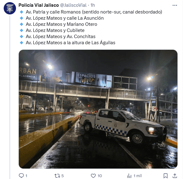 La lluvia constante que cae sobre el Área Metropolitana de Guadalajara (AMG) desde la madrugada de este viernes ha provocado múltiples afectaciones, donde destacan vialidades inundadas, lo que entorpece la circulación.Este es un recuento de los daños en cada municipio. A través de sus redes sociales, la unidad de Protección Civil y Bomberos de Zapopan informó que, debido a inundaciones y encharcamientos, se cerró la circulación en los puntos:Además, usuarios de redes sociales reportan que el tráfico se encuentra colapsado en López Mateos, antes de cruzar a Periférico, rumbo a Plaza del Sol. La Policía Vial del Estado informó del cierre total del paso a desnivel en Federalismo y avenida España, además del cierre parcial en Lázaro Cárdenas y Río Seco.También se reporta inundado el paso a desnivel en ambos sentidos en avenida Inglaterra, al cruce con Niños Héroes, en la colonia Jardines del Bosque.La circulación sobre la avenida México se ha visto afectada debido a un encharcamiento considerable. Un encharcamiento en los cruces de avenida La Cantera y Periférico Sur dificulta la salida hacia la colonia María Tequepexpan.Además, la avenía Comonfort, a la altura de Arroyo Seco, se encuentra inundada. Otra inundación severa se encuentra en Camino Real a Colima, a la altura de Bahía de Todos los Santos (Parques de Santa María). Usuarios reportan que la zona donde se realizan obras de la Línea 4, a la altura de Valle Real, se encuentra completamente inundada. * * * Mantente al día con las noticias, únete a nuestro canal de WhatsApp * * *MB