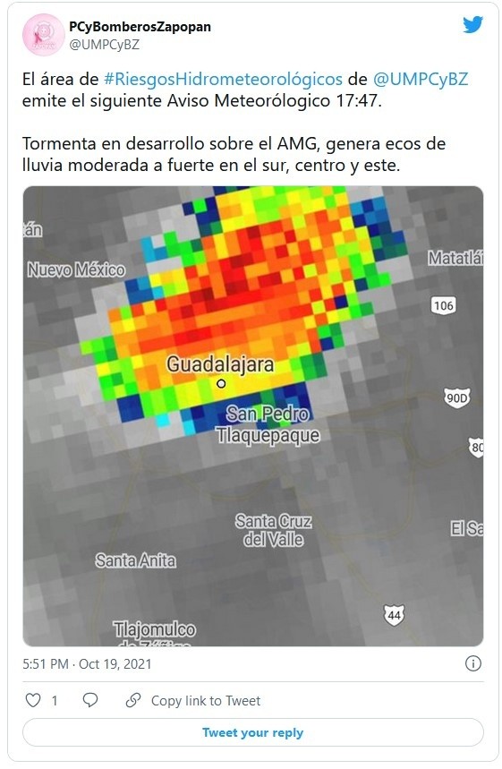 La tormenta de esta tarde en la Zona Metropolitana de Guadalajara tuvo sus principales afectaciones en los límites entre Guadalajara y Tlaquepaque, con cuatro zonas inundadas y tres árboles caídos.Según el Radar Doppler del Instituto de Astronomía y Meteorología de la Universidad de Guadalajara, la lluvia catalogada de intensidad fuerte con granizo comenzó aproximadamente a las 17:53 horas y se extendió hacia el sureste de la ciudad.Bomberos de Guadalajara reportaron cuatro puntos inundados entre ellos: Zona Industrial, Zona del Dean, colonia San Carlos y colonia El Rosario con 40 centímetros de profundidad del agua en el cruce de las calles Río Tuxcueca y Río Tizapan.Tres árboles cayeron, dos atendidos por los rescatistas tapatíos en el cruce de las calles de Río Nilo y Fray Antonio de Segovia; otro en calle Fresno y Gobernador Curiel; el último lo atendió la Unidad Estatal de Protección Civil y Bomberos Jalisco también retiraron un árbol caído en la vía pública, en el cruce de Olímpica y Río Rhin.Por su parte, bomberos de otras corporaciones en toda la Zona Metropolitana de Guadalajara no reportaron afectaciones.JM