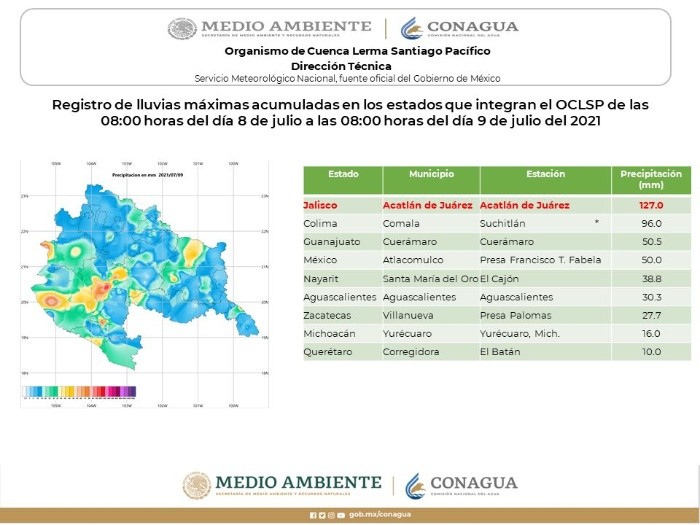 La fuerte lluvia que anoche azotó el municipio de Acatlán de Juárez, Jalisco, provocó daños en alrededor de 100 inmuebles, informó este viernes el Gobierno del Estado.Las delegaciones de Resolana y Bellavista del municipio son las que registran afectaciones por la lluvia."Durante las primeras evaluaciones que se realizaron por la madrugada, y como dato preliminar se contabilizaron aproximadamente 100 inmuebles afectados entre viviendas, comercios, edificios públicos, hoteles y centros educativos", dijo en un comunicado.Detalló que no se registraron personas lesionadas y que autoridades de los tres niveles realizan acciones para atender las afectaciones. Este viernes, agregó, los cuerpos de seguridad tanto municipales como estatales seguirán con labores de saneamiento en los inmuebles dañados y recorridos de supervisión en Acatlán de Juárez.Además seguirán los trabajados de desazolve y monitoreo en Paseo del Río y en el Canal La Resolana del municipio.La Comisión Nacional del Agua (Conagua) informó que entre las 8:00 horas del 8 de julio y las 8:00 horas del 9 de julio, se acumularon 127 litros por metro cuadrado en Acatlán de Juárez. Se trata de las mayores precipitaciones en Jalisco y estados de la Cuenca Lerma Santiago Pacífico.IM