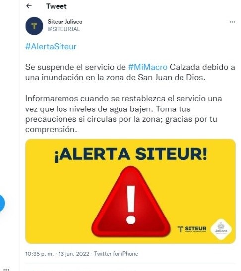 La Unidad de Bomberos de Guadalajara informó que debido a las lluvias ocurridas esta noche la Zona Metropolitana de Guadalajara, un árbol cayó sobre una joven.Los hechos ocurrieron en el cruce de Cuauhtémoc y Analco, según informó la dependencia.El árbol se volteó desde la raíz y cayó sobre la mujer de alrededor de 20 años, causándole lesiones en cadera.La mujer herida fue trasladada por la Cruz Roja tras ser rescatada por los elementos de Protección Civil. Además de ese, otros árboles cayeron en Pensador Mexicano y Pedro Catani; Monte la Luna y Puerto Progreso y Avenida Federalismo y Calle Montenegro.En Monte La Luna y Puerto Progreso se desplomó otro árbol.También se informó que hay vehículos varados en el túnel de Avenida Hidalgo, por lo que está cerrado a la circulación.Además, el agua ingresó a domicilios de la colonia Santa Elena Estadio. También se habla de autos varados en esa zona debido al desbordamiento del canal de Avenida Normalistas. Por la avenida Maestros, en la Glorieta del Cartero, se reporta que el agua arrastró varios carros.La precipitación se registró fuerte en la zona de La Normal, Centro, Tetlán, y Oblatos; entre otros puntos de la Zona Metropolitana de Guadalajara. La Unidad de Protección Civil y Bomberos de Guadalajara reportó inundación vía pública en el cruce de avenida Circunvalación y la calle Félix Palavicini. También el cruce de las calles Juan Álvarez y Pípila, donde se registraron automóviles varados, aunque aún no se precisa el número de coches ni si tuvieron que ser rescatadas personas.En Zapopan reportaron lluvia de moderada a intensa en el noreste del municipio.Al momento en Tlaquepaque sin afectación de viviendas, pero continúa la lluvia de regular a fuerte en zona centro, Vergel, Miravalle Cerro del Cuatro, Álamo, Tapatío.-Analco -Belisario Domínguez -Olímpica -El Retiro -Normalistas -San Juan de Dios -Jardines Alcalde -José Ma. Vigil y Cruz Verde -Federación y Juan Díaz Covarrubias -Sierra Nevada y Sierra Madre -Calzada Federalismo y Jesús GarcíaAmado -Aguirre y Normalistas -Manuel Doblado e Industria -Pípila y Juan ÁlvarezSe detalló que Protección Civil atiende diversos reportes de vehículos varados y algunos de personas arrastradas por corrientes de agua.Patria al cruce de Ávila Camacho se encuentra cerrada. El Siteur informó que suspendió el servicio de Macrobús en la Calzada debido a una inundación en la zona de San Juan de Dios.La dependencia dijo que informará cuando se restablezca el servicio una vez que los niveles de agua bajen. A las 22:48, la dependencia informó que "solo se ofrece servicio provisional en #MiMacro Calzada de la estación Alameda a Mirador". Quevedo y Zubieta a cruce Belisario Domínguez.