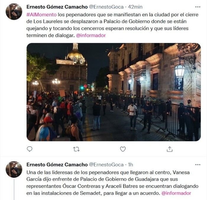 Aproximadamente 34 kilómetros caminaron pepenadores del recién cerrado relleno sanitario Los Laureles, casi por diez horas, para finalmente llegar al Centro de Guadalajara y manifestarse al no saber qué les deparará con el cierre del basurero. Los manifestantes esperan que sus líderes terminen de dialogar en las instalaciones de Semadet Jalisco.Desde las 8:00 horas, los recolectores comenzaron a caminar desde el vertedero Los Laureles, ubicado en Tonalá, tomaron camino por toda la carretera libre a Zapotlanejo con el rumbo a Guadalajara y de ahí bajaron por avenida Revolución. En todo momento la circulación para los automovilistas se colapsó.En total, 496 pepenadores caminaron para llegar finalmente al primer cuadro de la ciudad a las 18:15 horas. Ahí gritaron emocionados que sí cumplieron su recorrido: “Sí se pudo”, entonaban cantando.El trayecto los cansó, y uno de los líderes, Miguel Cruz, les pidió que ya descansaran en Plaza Guadalajara y que les llevarían los víveres y aguas para que se recuperaran.Ahí en Plaza Guadalajara estuvieron aproximadamente 40 minutos, posteriormente los manifestantes se dirigieron a Palacio de Gobierno, el cual ya estaba cercado y protegido con mujeres policías viales.Hasta el momento, la manifestación ha sido pacífica y no ha habido ningún acto vandálico.Trascendió que la lideresa de los pepenadores, Araceli Batres; Antonio Álvarez Esparza, líder sindical de la CROC, y también Óscar David Contreras, líder de los recolectores y chóferes de Caabsa, están dialogando con Sergio Humberto Graf, secretario de Medio Ambiente y Desarrollo Territorial (Semadet). Hasta que no se defina una postura los pepenadores se van a mover.JM