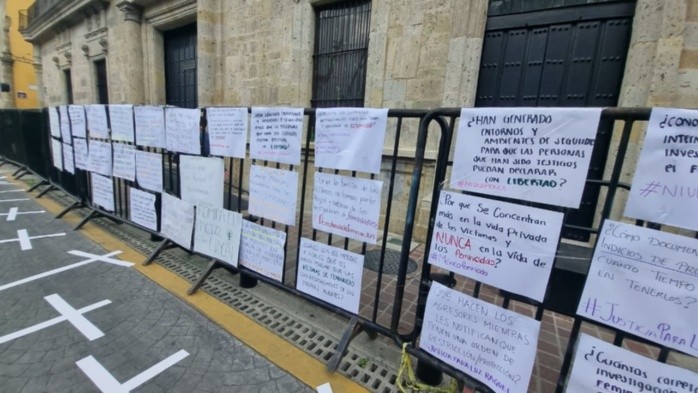 Integrantes de colectivas feministas protestaron frente al Congreso de Jalisco en rechazo a la comparecencia a puerta cerrada del fiscal estatal Luis Joaquín Méndez, por el caso del Luz Raquel Padilla. Las activistas colocaron en las vallas del cerco cartulinas con preguntas a los funcionarios y consignas exigiendo justicia.“Una comparecencia del fiscal para revisar una carpeta de investigación no es facultad del Legislativo, quieren una reunión entre cuates para tratar de parar algo que el propio fiscal destapó. No nos quieren dar la cara, esta administración no le da la cara a las mujeres y no nos dice de frente qué sucede con la Fiscalía y con las carpetas de investigación, no sólo de Luz Raquel, sino de todas las carpetas abiertas”, expuso Sandra Quiñonez coordinadora del Comité de América Latina y el Caribe para la Defensa de los Derechos de las Mujeres (Cladem)Las manifestantes condenaron que el ejercicio fuera reservado y solicitaron ser atendidas por los integrantes de la Junta de Coordinación Política para entregarles 13 mil firmas de respaldo a que la comparecencia fuera pública. La diputada de Morena, Claudia García Hernández, salió a dialogar con las activistas que rechazaron la interlocución. En la protesta participó Candelaria Ochoa, regidora de Morena en Guadalajara y Valeria Ávila vicepresidenta de Hagamos.El director General en Delitos de Violencia contra las Mujeres en Razón de Genero y Trata de Personas, Jorge Baltazar Pardo Ramírez, encargado del Centro de Justicia para las Mujeres y Jorge Alberto Arizpe García, comisario general de seguridad pública de Zapopan, llegaron al Congreso una hora antes de la comparecencia, a la cual también asistió la secretaria de igualdad Paola Lazo Corvera. Los funcionarios no ingresaron por la puerta principal.La sesión reservada comenzó con sólo once diputadas y diputados presentes.