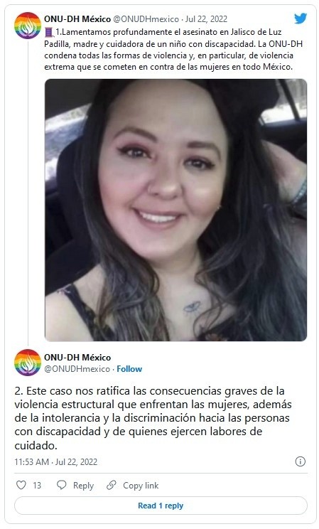La Organización Nacional de las Naciones Unidas en México (ONU-DH México) hizo un llamado a las autoridades para que redoblen esfuerzos a fin de realizar una investigación profunda respecto del caso de Luz Raquel Padilla, considerando el activismo que ella desempeñaba.Lo anterior, a fin de que se pueda esclarecer lo ocurrido, se encuentre y se sancione a los responsables, y se logre una reparación integral del daño a sus familiares.El asesinato de Luz Raquel, dijo, no sólo exhibe la gravedad de la violencia que existe contra las mujeres, sino que además demuestra la falta de tolerancia hacia las personas con discapacidad o diagnosticadas con alguna condición distinta.“Este caso nos ratifica las consecuencias graves de la violencia estructural que enfrentan las mujeres, además de la intolerancia y la discriminación hacia las personas con discapacidad y de quienes ejercen labores de cuidado”, señaló la ONU en México.Además, la organización envió condolencias y se solidarizó con la familia de la joven, quien este sábado cumplirá una semana de haber sido quemada viva, hecho que le dejó heridas graves de las cuales no resistió, y falleció dos días después.“Lamentamos profundamente el asesinato en Jalisco de Luz Padilla, madre y cuidadora de un niño con discapacidad. La ONU-DH condena todas las formas de violencia y, en particular, de violencia extrema que se cometen en contra de las mujeres en todo México”, expresó el organismo.JM