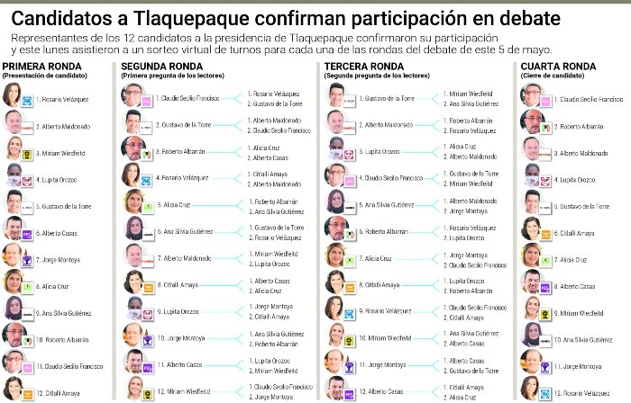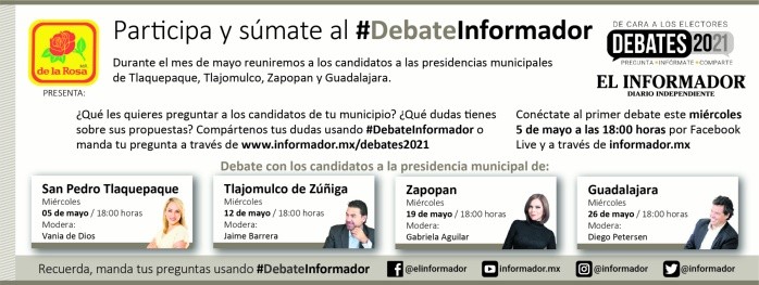 Previo a la elección del 6 de junio, EL INFORMADOR organiza “De cara a los electores: DEBATES EL INFORMADOR 2021”, un encuentro con candidatos a las alcaldías de Tlaquepaque, Tlajomulco, Zapopan y Guadalajara.Este miércoles 5 de mayo será el primero con los aspirantes a gobernar la Villa Alfarera. Lo moderará Vania de Dios, colaboradora de esta casa editorial. Se desarrollará por la plataforma Zoom y se transmitirá a las 18:00 horas en informador.mx y sus redes sociales.En dos de las cuatro rondas los candidatos responderán las preguntas enviadas por nuestros lectores a través de informador.mx/debates2021.JL