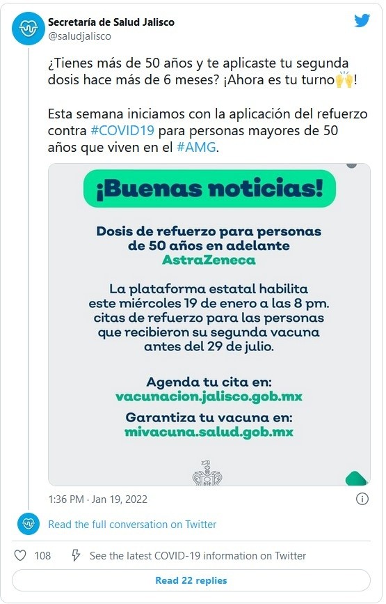 A partir de las 20:00 horas de este miércoles será habilitada la plataforma https://vacunacion.jalisco.gob.mx/ para la obtención de citas para la vacuna de refuerzo de personas mayores de 50 años de la Zona Metropolitana de Guadalajara.Así lo dio a conocer este día la Secretaría de Salud Jalisco, que informó que a la misma hora se abrirá una nueva jornada de vacunación contra COVID-19 para las personas adultas que no han recibido ninguna dosis (rezagados).“Es una nueva oportunidad de protegerse ante los contagios de esta enfermedad y cuidar también de los demás”, indicó el titular de la dependencia, Fernando Petersen Aranguren, a través de un comunicado.También serán habilitadas jornadas para otros grupos de población: se aplicará el refuerzo de la vacuna a personas de 50 años o más que hayan recibido su última dosis hace más de seis meses.Asimismo, se habilita la convocatoria de primeras dosis para adolescentes de 14 a 17 años (los de 14 que cumplan 15 años este 2022) y de igual forma podrán agendar su cita para suministrar las segundas dosis a las y los adolescentes de 15 a 17 años que hayan recibido su primera dosis de la vacuna Pfizer-BioNTech antes del 15 de diciembre.El sistema también otorgará citas para segundas dosis a personas mayores de 18 años que hayan recibido la vacuna Pfizer-BioNTech antes del 15 de diciembre pasado.Una convocatoria más incluye citas para segundas dosis de la farmacéutica AstraZeneca a personas que se hayan vacunado antes del 22 de noviembre pasado.“La SSJ recuerda que actualmente se están llevando a cabo jornadas de vacunación contra COVID-19 en las diversas regiones del territorio estatal y se cubrirán paulatinamente los 125 municipios del estado”.Por ello invitó a la población a mantenerse atenta a las convocatorias realizadas a través de los canales oficiales de la Secretaría de Salud y el Gobierno de Jalisco, donde se dan a conocer fecha y puntos de las próximas jornadas de vacunación; y a informarse también en sus gobiernos municipales.“La vacuna es una valiosa herramienta para reducir el riesgo de complicaciones por la infección del coronavirus, pero es muy importante continuar aplicando las medidas preventivas para evitar contagios: el uso adecuado del cubrebocas, la sana distancia, el lavado frecuente de manos y evitar sitios cerrados que incumplan protocolos sanitarios”, finalizó la Secretaría de Salud estatal.Ingresar la CURP en la plataforma estatal vacunacion.jalisco.gob.mx, donde se entregará el folio, lugar y hora en la cual se deberá acudir a recibir el biológico. Además, realizar el registro federal en el sitio mivacuna.salud.gob.mx con el cual se garantiza la vacuna.JM