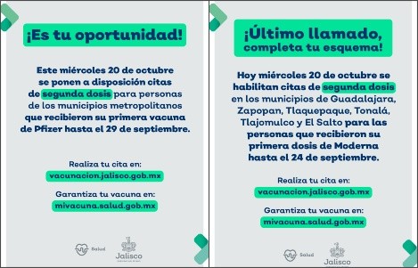 La Secretaría de Salud Jalisco (SSJ) anunció que ya quedó abierto el registro en la página estatal https://vacunacion.jalisco.gob.mx/ para quienes aún falten por recibir la segunda dosis de la vacuna contra el COVID-19 de la farmacéutica de Moderna y Pfizer. En un mensaje en sus redes sociales, la SSJ dijo que podrán agendar cita las personas que hayan recibido la primera dosis de la vacuna Moderna hasta el 24 de septiembre, mientras que para Pfizer, sólo los que recibieron la primera vacuna antes del 29 de septiembre.La Secretaría de Salud Jalisco (SSJ) hace un llamado a todos los ciudadanos de Jalisco a llevar muy bien todos los datos, para que no haya contratiempos, sin embargo, cualquier duda que tengas puedes ingresar a la página coronavirus.jalisco.gob.mx/ruta-de-la-vacunacion/.https://coronavirus.jalisco.gob.mx/ruta-de-la-vacunacion/Si te interesó esta noticia y quieres saber más, entonces descarga y descubre INFORMAPlus, la aplicación digital de EL INFORMADOR, en donde tenemos contenidos exclusivos, seleccionados por nuestros editores, para darles una experiencia más completa a los lectores. Si eres suscriptor de EL INFORMADOR tu acceso está incluido, solicítalo al 33 3678-7777.Descarga la aplicación y pruébala GRATIS por treinta días.Para iOS: https://apple.co/35jaVgbPara Android: https://bit.ly/3gwVSEVSi eres suscriptor de EL INFORMADOR tu acceso está incluido, solicítalo al 33 3678-7777