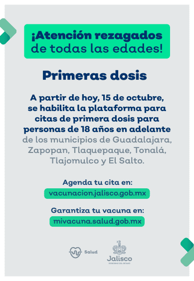 La Secretaría de Salud Jalisco (SSJ) informó que a partir del viernes 15 de octubre se abrió el registro en la plataforma vacunacion.jalisco.gob.mx/ para todas las personas mayores de 18 años que no han recibido ninguna dosis de la vacuna contra el COVID-19. La dependencia señaló en sus redes sociales que desde ayer viernes los ciudadanos que habiten en algún municipio de la Zona Metropolitana de Guadalajara (ZMG), como Tonalá, Guadalajara, Zapopan, El Salto, Tlajomulco y Tlaquepaque y deseen vacunarse contra el COVID-19 podrán agendar su cita en la plataforma estatal.“Si resides en el área metropolitana o conoces a alguien que no cuenta con su vacuna es la oportunidad de hacer su cita para todos los grupos de edad disponibles”, se lee en el mensaje.Esta campaña de vacunación es para todos los rezagados que por alguna u otra razón no han podido acudir a vacunarse. Apenas el pasado 10 de octubre, la SSJ presumía que en la semana del 4 al 8 del mismo mes se aplicaron 501 mil 100 vacunas contra el COVID-19, cantidad que por sí sola representa lo que se aplica en un día en todo el país. Al llegar al macromódulo de vacunación, deberás presentar: