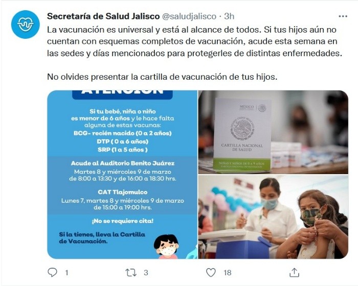 En Jalisco, siete de cada diez personas mayores de 18 años tienen esquema completo de la vacuna contra COVID-19 y cerca de la mitad ya se aplicaron el refuerzo, informó la Secretaría de Salud del Estado. Detallaron que, con el arribo de más vacunas, continuarán aplicando el biológico de refuerzo también en municipios del interior del estado, sin necesidad de cita, y se avanzará en completar esquemas conforme a lo contemplado dentro del Plan Nacional de Vacunación y según la fecha que corresponda por la aplicación de su última dosis.Durante la semana epidemiológica 9 (del 27 de febrero al 5 de marzo) 74 mil 386 personas acudieron a recibir alguna dosis de la vacuna para protegerse contra el COVID-19; de las cuales 56 mil 729 recibieron la vacuna de CanSino.Este 8 de marzo arribó el cargamento número 56 de vacunas, con 295 mil dosis del laboratorio AstraZeneca; y se abrieron nuevas jornadas de vacunación para la población. El secretario de salud en la entidad, Fernando Petersen informó que se utilizarán para continuar con la aplicación de la vacuna de refuerzo a personas mayores de 30 años.En la séptima semana del retorno a clases presenciales, la Secretaría de Salud Jalisco (SSJ), en coordinación con la Secretaría de Educación Jalisco (SE), reportaron que en el grupo de tres a 14 años (educación básica) suman 165 los casos que iniciaron síntomas en los últimos 14 días, de los cuales sólo 18 se identificaron en escuelas. La mayor parte de los casos positivos en este rango de edad se presentan en la Área Metropolitana de Guadalajara (AMG).Los casos fueron identificados en 40 escuelas, de las 13 mil 415 de educación básica que hay en todo el Estado.En alumnos de 15 a 25 años suman 326 casos que iniciaron síntomas en los últimos 14 días. También la mayor parte de los casos positivos fueron en la AMG.De acuerdo con la SE, esta última semana acudió presencialmente el 86.96 % de alumnos de preescolar, primaria y secundaria, es decir un millón 444 mil 153. Se mantiene el modelo educativo a distancia y será aplicable conforme se requiera a las necesidades de alumnos o a los acuerdos de la Mesa de Salud.Continúa el modelo de aplicación de pruebas aleatorias de COVID-19 para el personal educativo en planteles escolares, esta semana se realizó en 61 escuelas donde se tomaron un total de 791 pruebas de antígeno, de éstas 12 dieron positivo.JM