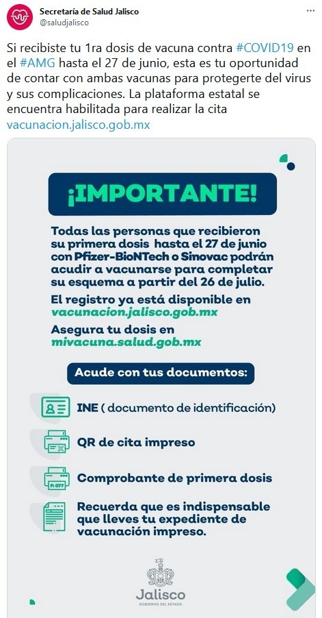 La Secretaría de Salud Jalisco informó que ya se encuentra habilitada la plataforma estatal para realizar la cita: https://vacunacion.jalisco.gob.mx.