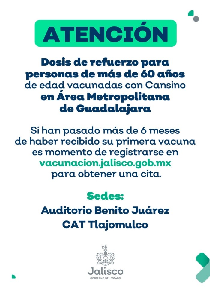Ya está abierto el registro para citas de vacunas de refuerzo contra COVID-19 para adultos mayores de 60 años en la Zona Metropolitana de Guadalajara, que hayan sido vacunados antes del 10 de junio con la vacuna Cansino. La Secretaría de Salud Jalisco informó que quedó habilitada la plataforma estatal vacunacion.jalisco.gob.mx para que ese grupo de adultos mayores que residan en alguno de seis municipios de la ZMG -Tonalá, Tlaquepaque, Zapopan, Tlajomulco, El Salto y Guadalajara-, puedan acudir por su dosis de refuerzo. Se incluye a docentes que cubran el requisito de edad.La vacunación se realizará en dos puntos: el macromódulo del Auditorio Benito Juárez, en Zapopan, y en el Centro Administrativo de Tlajomulco (CAT).Ayer comenzó la aplicación del refuerzo contra COVID-19 para mayores de 60 años en cuatro muncipios de Jalisco: Ameca, Tala, Lagos de Moreno, y Ciudad Guzmán.Autoridades adelantaron que próximamente se aplicará el refuerzo en otros 25 municipios para llegar a un total de 29 en el interior del Estado en una primera etapa.Para más información sobre las jornadas de vacunación vigentes en Jalisco, consulta: https://coronavirus.jalisco.gob.mx/ruta-de-la-vacunacion/El secretario de Salud estatal, Fernando Petersen, informó en redes sociales que anoche llegó a Jalisco un cargamento de 425 mil 190 vacunas anti COVID-19.Incluye 300 mil dosis de AstraZeneca que se destinarán a aplicar el refuerzo a adultos mayores de 60 años.Y 125 mil 190 de Pfizer, que serán para primeras dosis a adolescentes de 12 a 14 años con alguna vulnerabilidad, así como a jóvenes de 15 a 17 años en general. IM